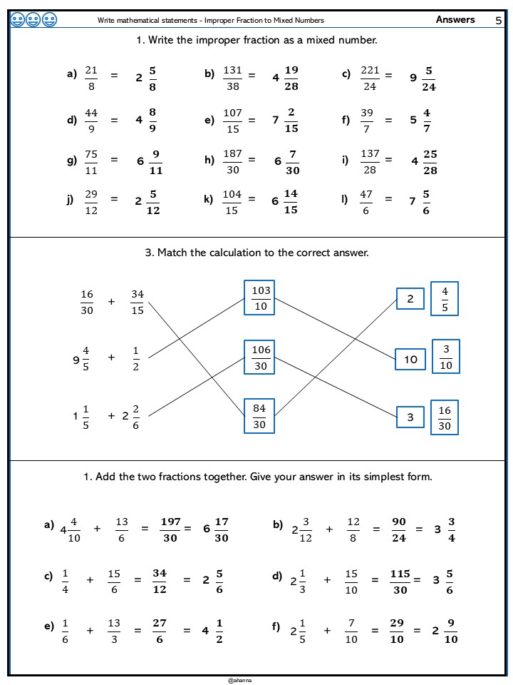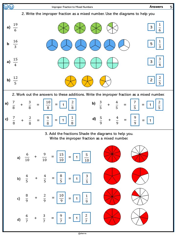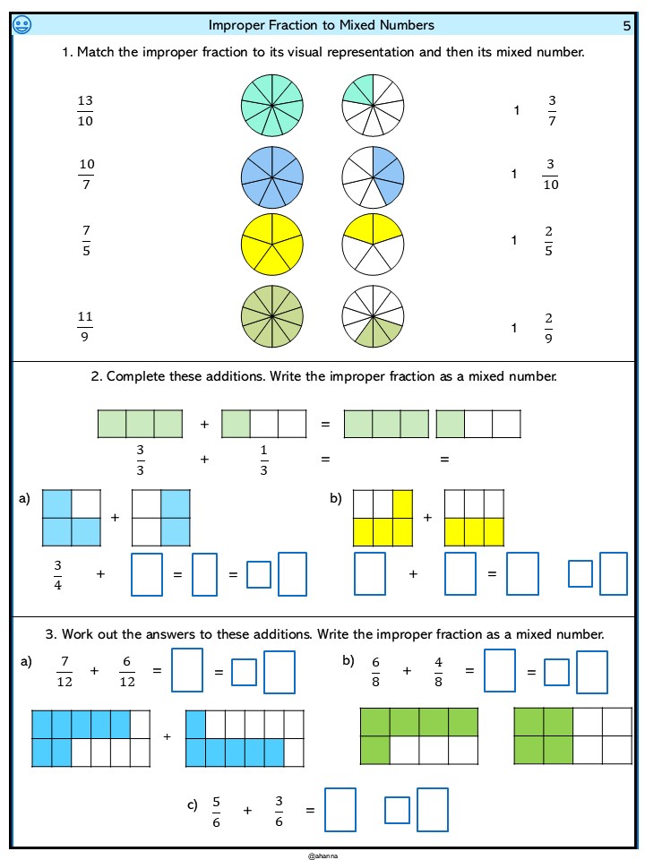Children add fractions greater than 1 . They convert the improper fractions to mixed numbers. Includes some pictorial representations.
