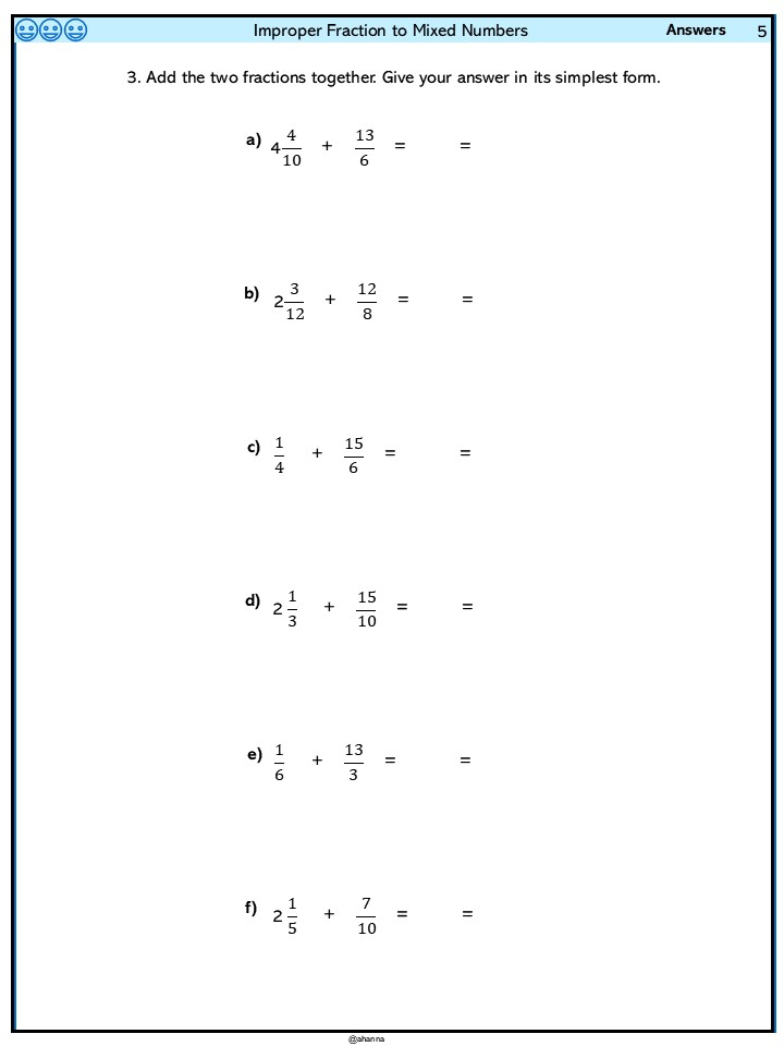 Children add fractions greater than 1 to a mixed number where the denominators are not direct multiples of each other and record the answers in their simplest form. They convert the improper fractions to mixed numbers.