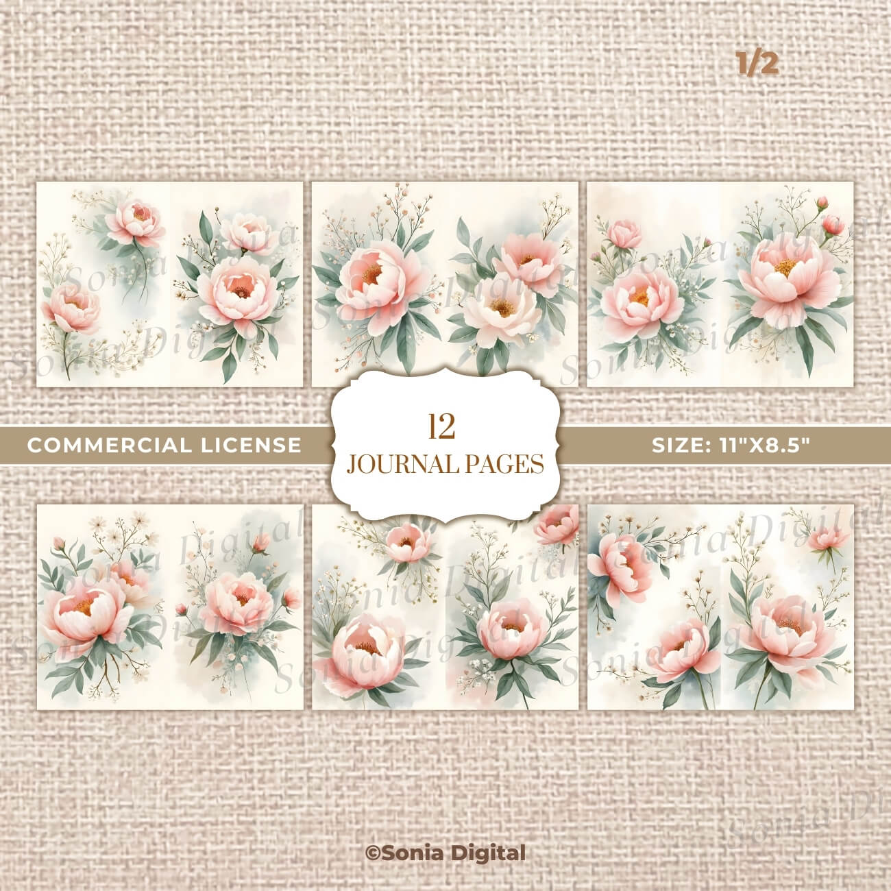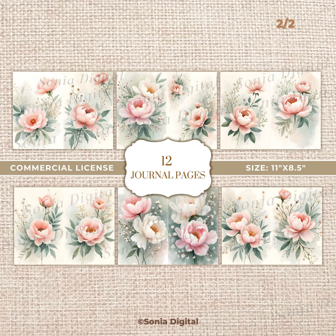 12 printable Journal Pages, “Pink Peonies” Collection (Vol 1), for Scrapbooking and Junk Journal creations. Letter size (11”x8.5”, Landscape Format). Commercial use license included*