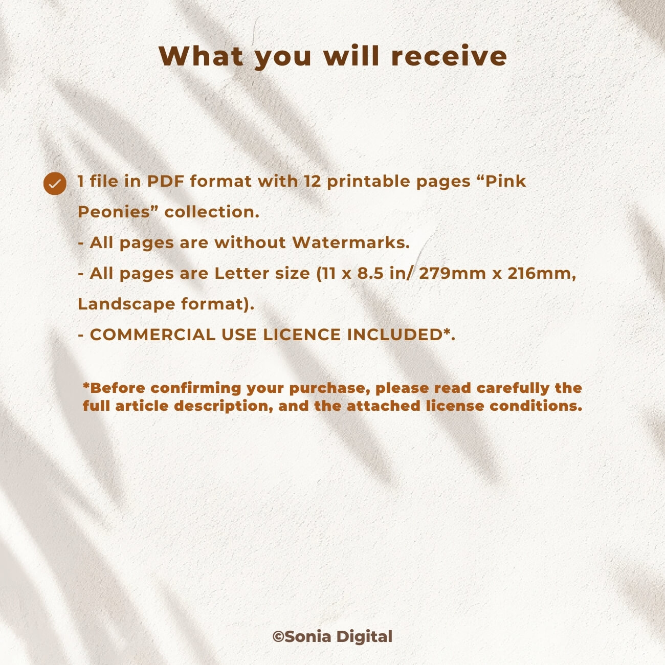 🔸12 printable Journal Pages, “Pink Peonies” Collection (Vol 1), in Letter size 11”x8.5”, Landscape Format. All pages are sold without Watermarks. Commercial use license included*.