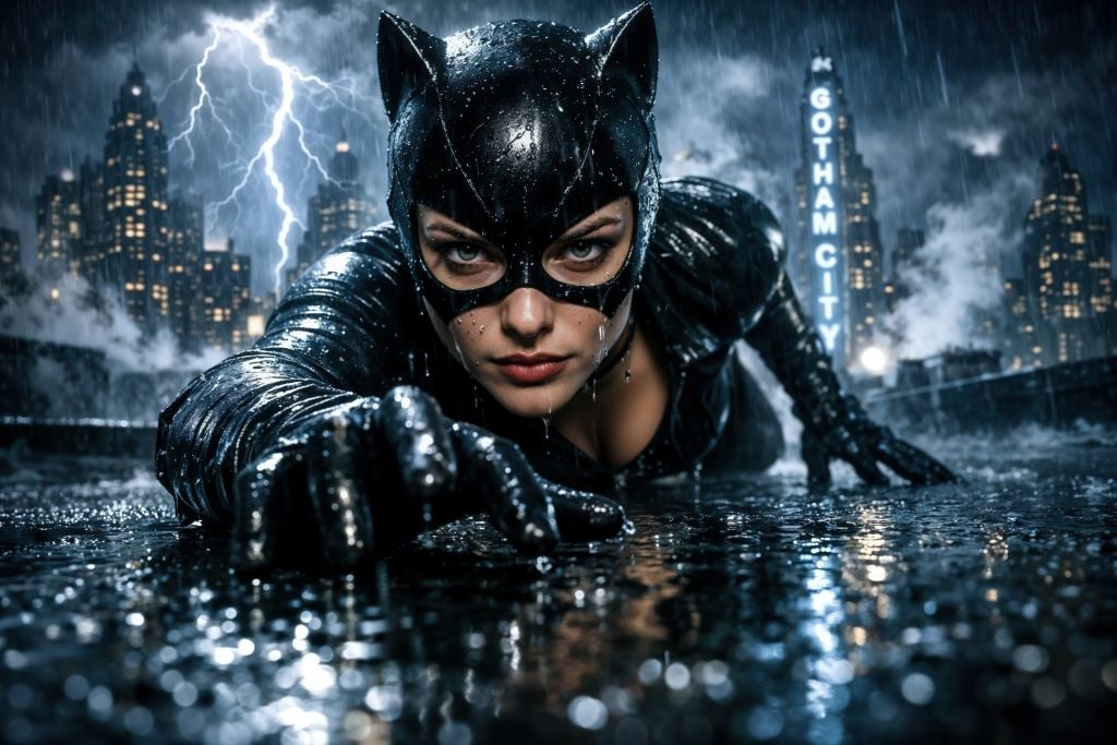 Rain turns the streets to glass. Lightning splits the skyline. And Catwoman crawls forward like the city itself can’t stop her.