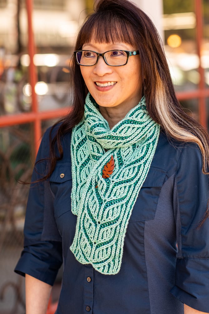 The Green Tea Chai Scarf is a two color brioche scarf, knit flat. Regular increases and decreases create the leafy pattern.