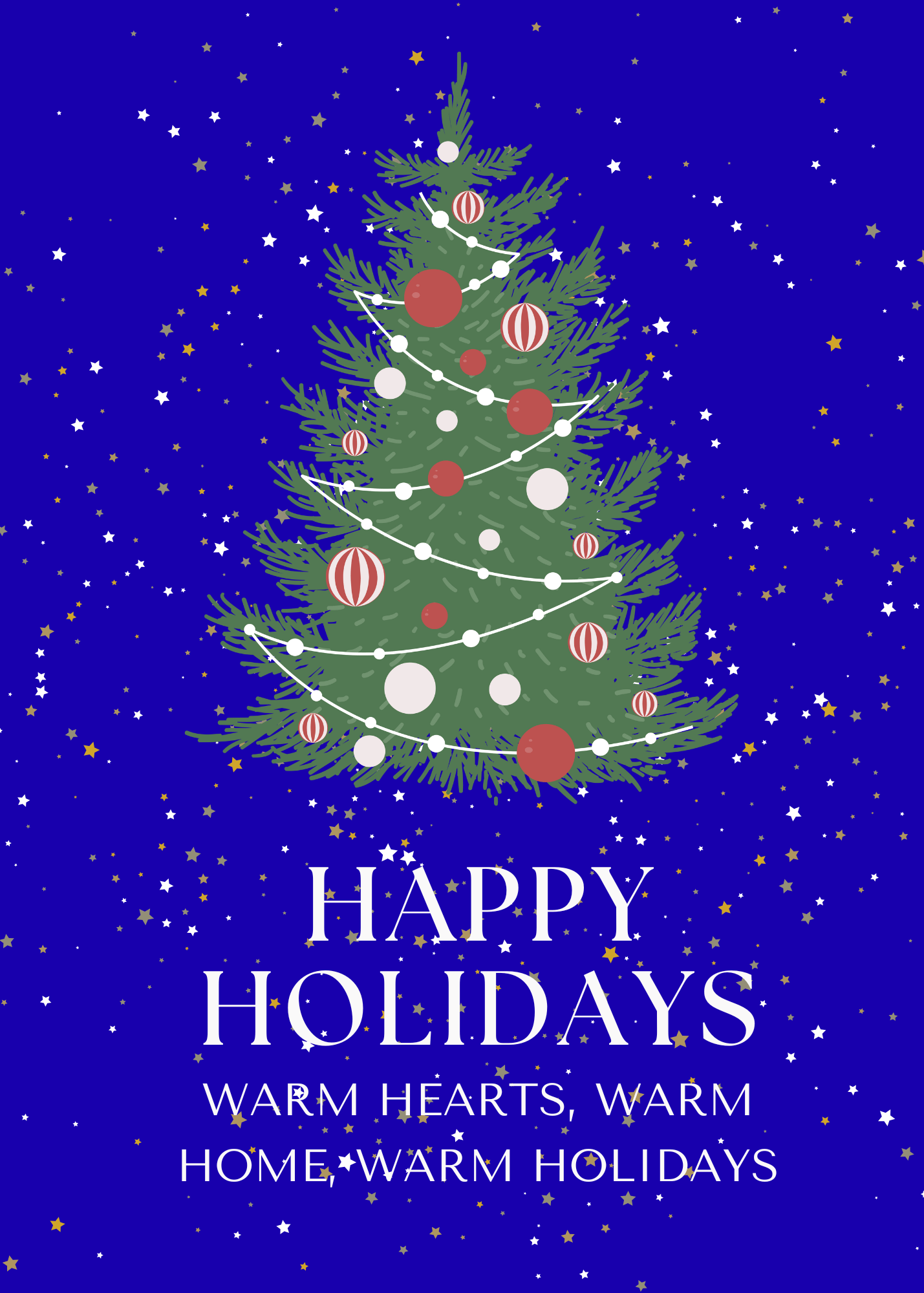 Add a festive touch to your home or event with this beautifully illustrated Happy Holidays poster. Featuring a decorated evergreen tree against a starry night sky and the warm message “Warm Hearts, Warm Home, Warm Holidays,” this design brings cozy seasonal charm to any space.