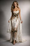 The dress showcases a fitted silhouette with cascading botanical embroidery that flows organically through the fabric, creating a graceful and artistic couture aesthetic. Soft neutral tones and studio lighting emphasize the luxurious textures and handcrafted elegance of the garment.