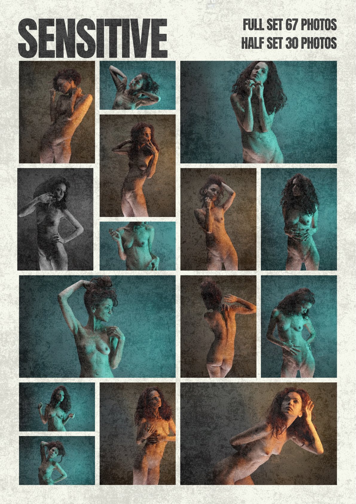 This series explores the nude figure as energy in motion—writhing, reaching, contracting. Shot with strong colored lights (teal, amber, shadow), the images convey intensity, vulnerability, and raw emotional rhythm.