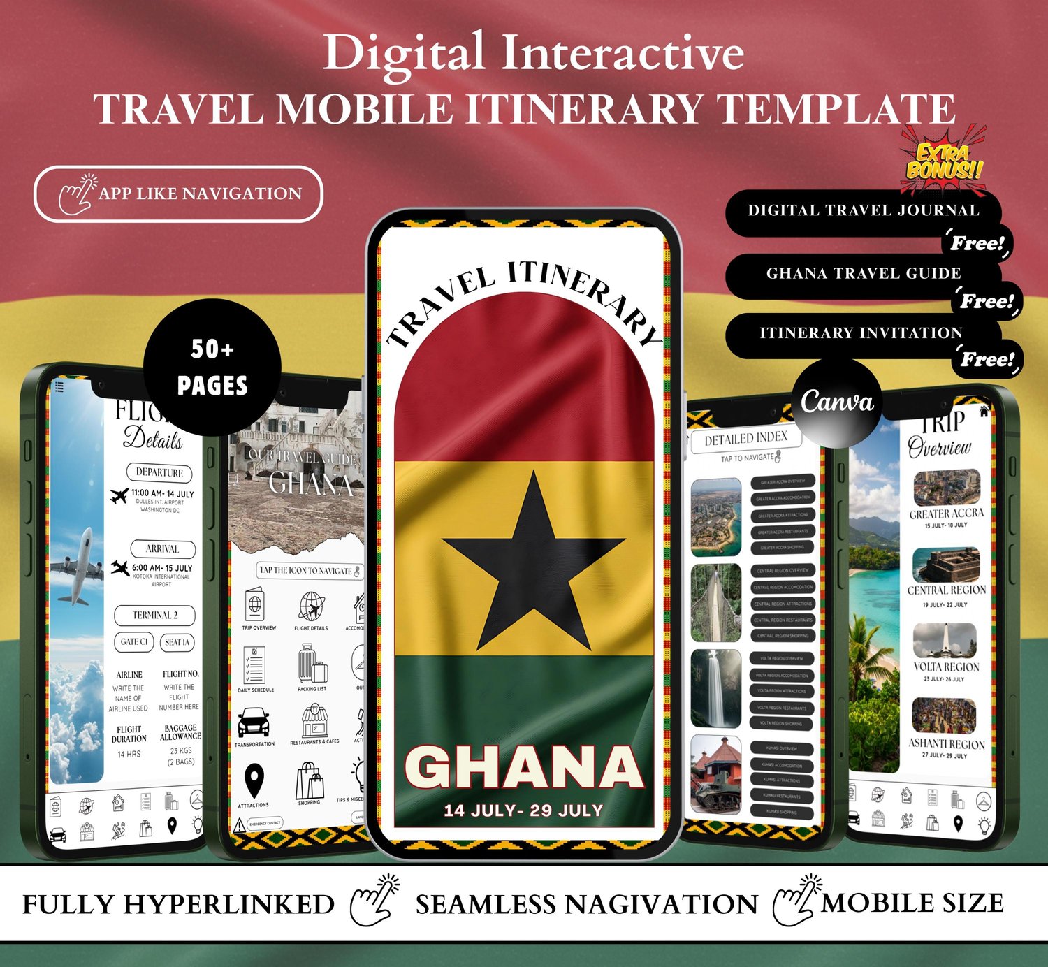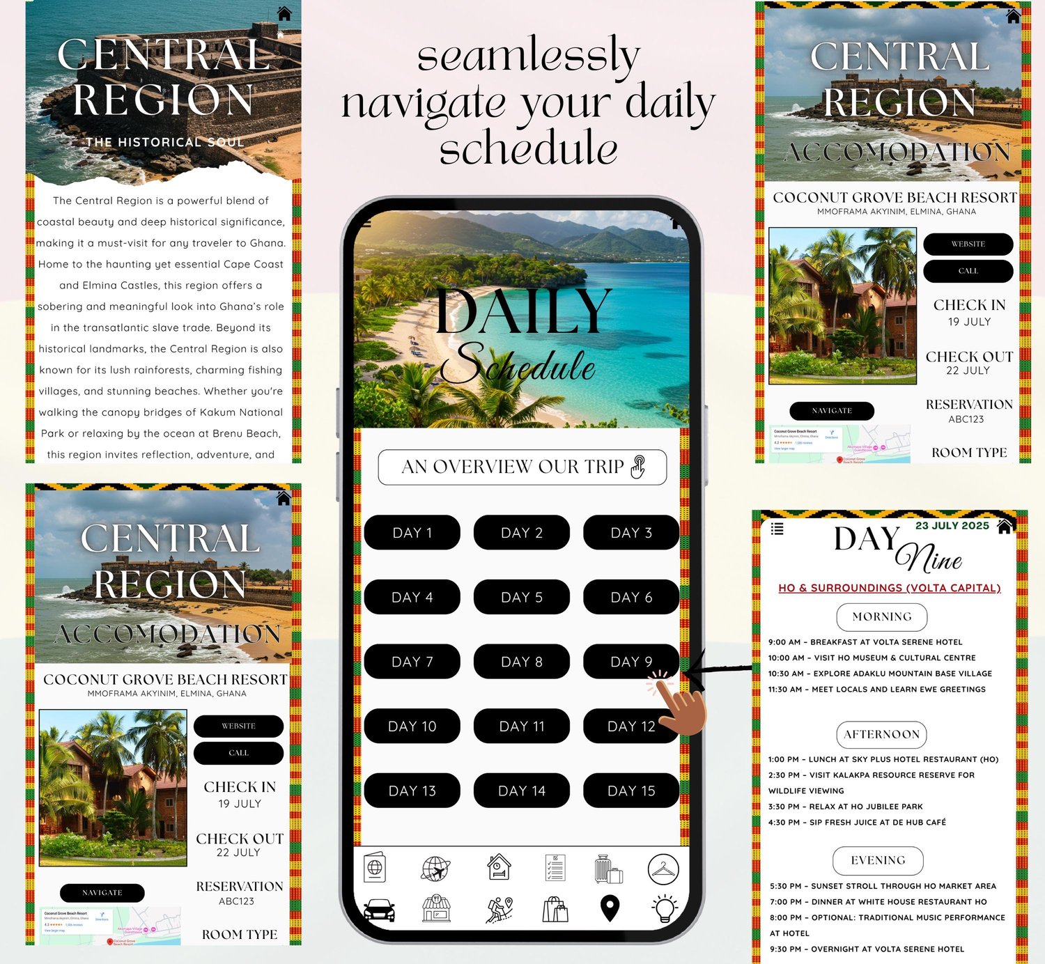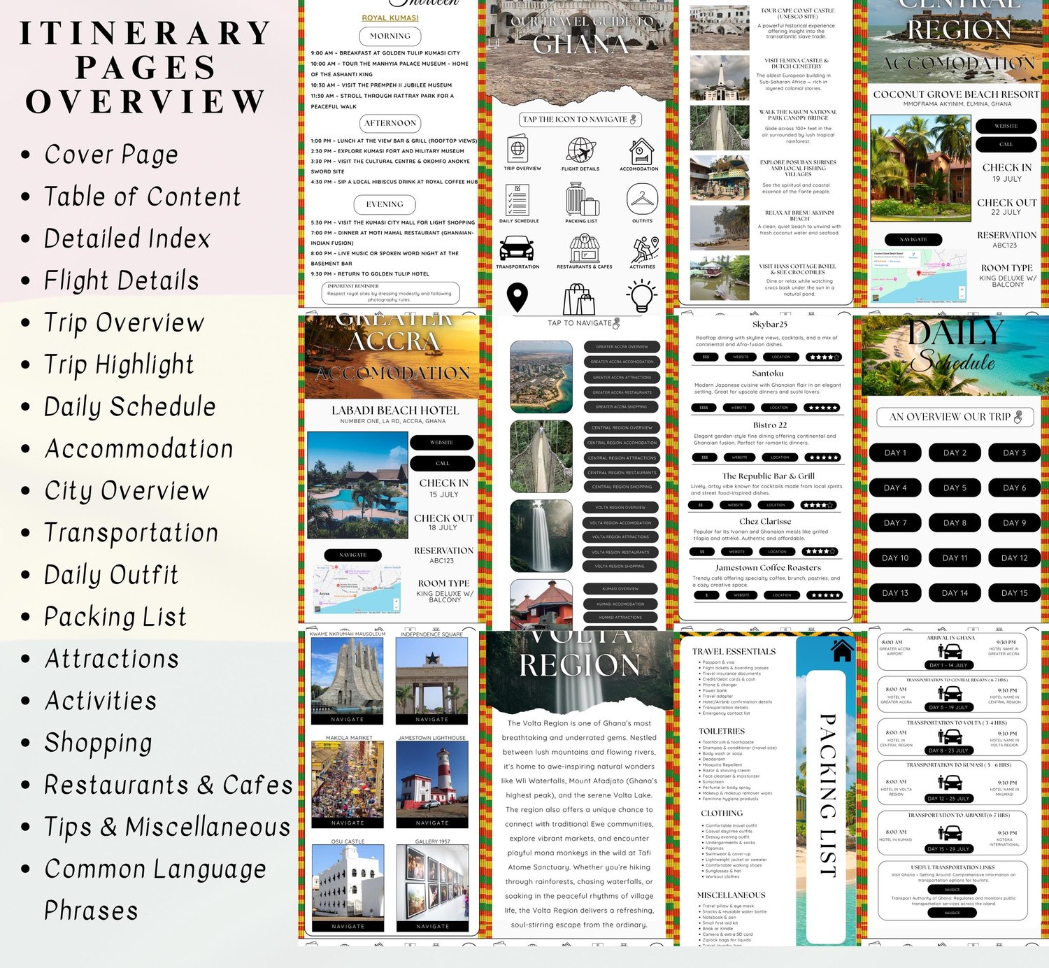 Enhance your travel experience with this Ghana Digital Travel Itinerary Template — the ultimate travel companion for discovering West Africa’s most vibrant and culturally rich destination.