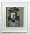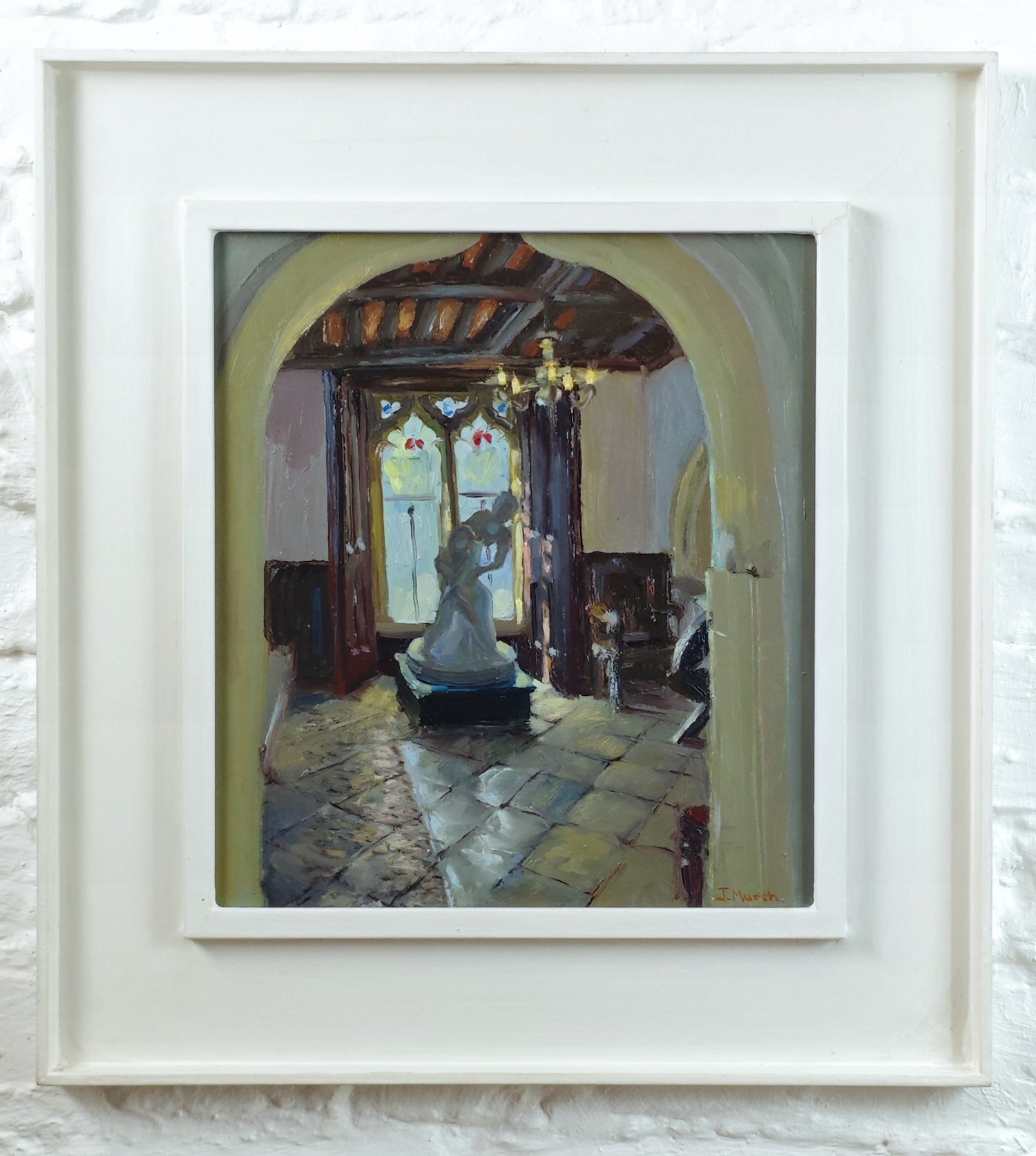 Painted from life during the artist’s residency at Torre Abbey, showing light filtering through a restored monastic window onto the stone floor. A sculpture of a mother and child stands silhouetted in the centre of the room.