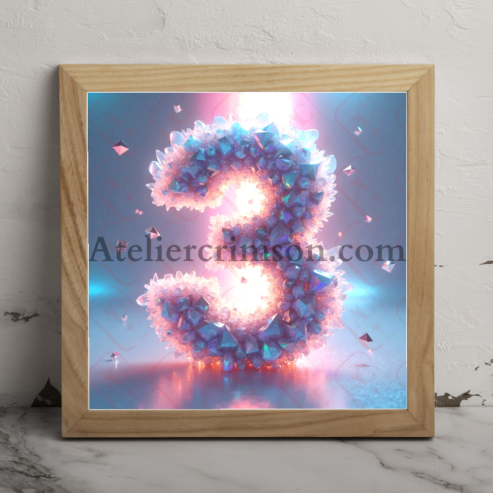 Number 3 crystalline Retro Futuristic C A unique creation blending retro-futuristic aesthetics and geometric elegance. Each character is sculpted from iridescent crystals in vibrant, nostalgic hues, set in delicate silver filigree. Against a gradient background transitioning from deep purple to teal blue, this digital artwork captures the essence of 80s-inspired digital art with a touch of crystalline luxury. Perfect for typography enthusiasts, digital art lovers, and those who appreciate retro-futuristic aesthetics.