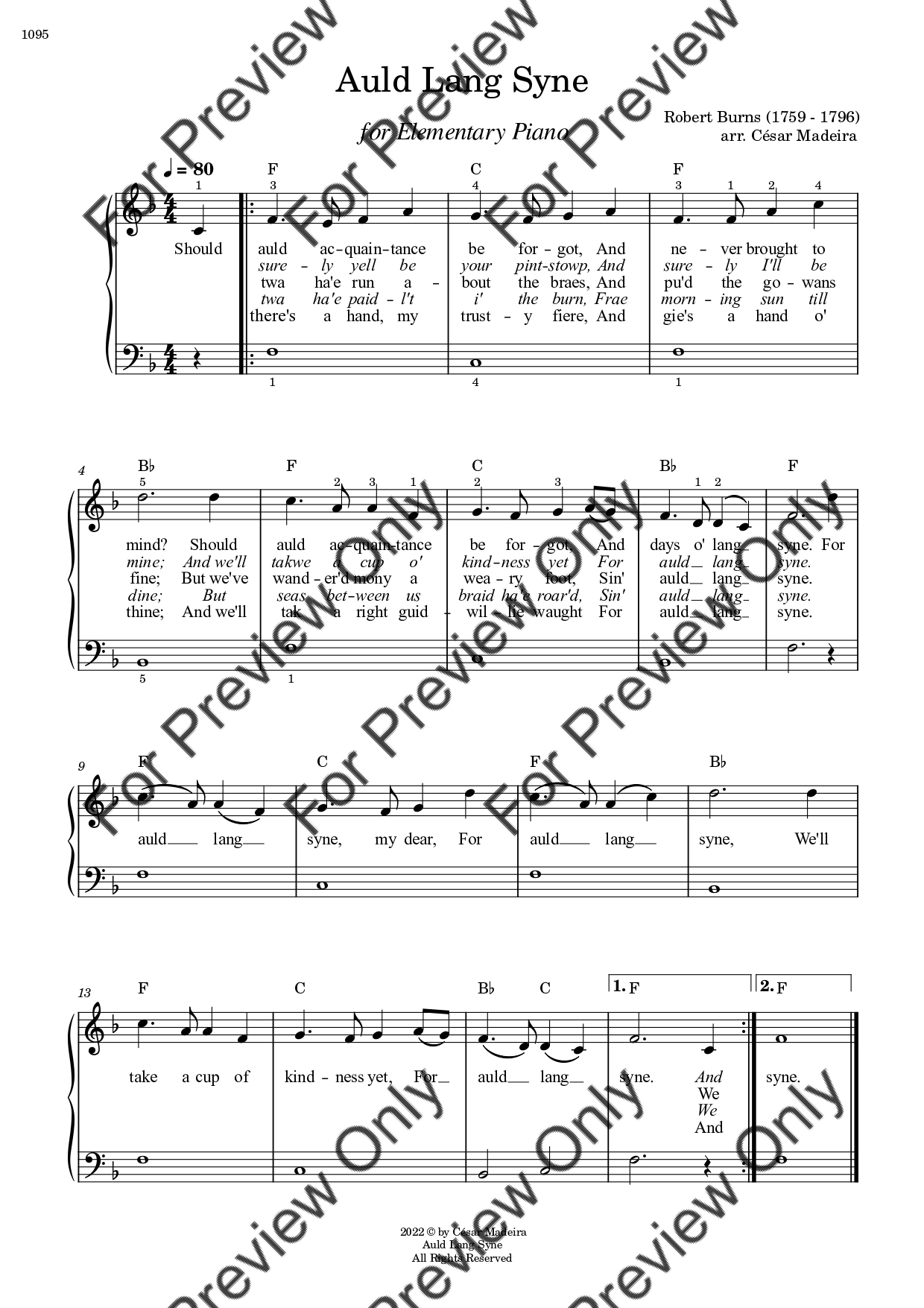 Auld Lang Syne by Robert Burns. Arrangement for Elementary/Very Easy Piano. With Full Score. Have fun!