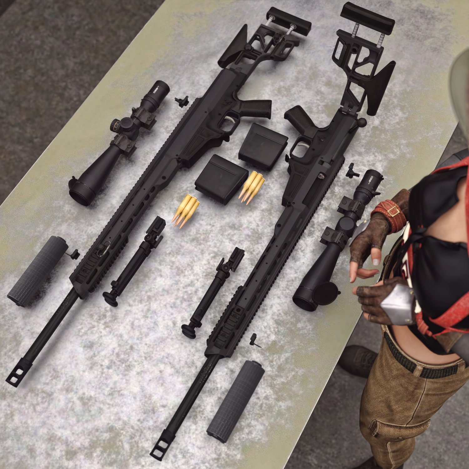 The Multi Caliber Precision Rifle is made based on a Barret MRAD model. Bolt action sniper rifle in .300 caliber, provides great performance, ergonomics and precision. Rigged and converted for use with DAZ. Good power and looks in the modern fashion. Trigger, safety, bolt, etc also rigged for more realistic pictures. Includes a silencer, optics and bipod for various porpoises and pictures. Stock folds and adjusts to make this rifle a bit more easy to carry.