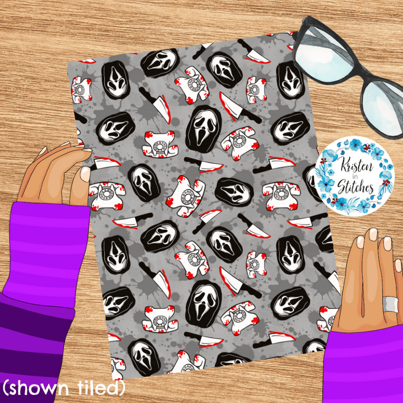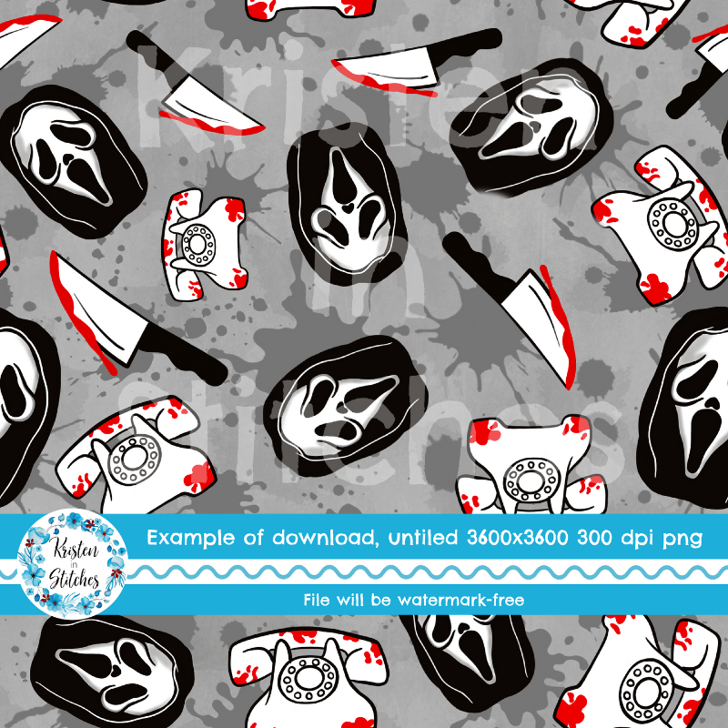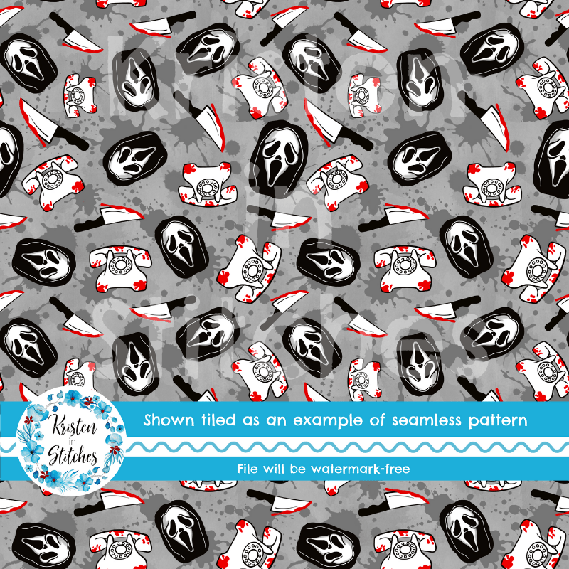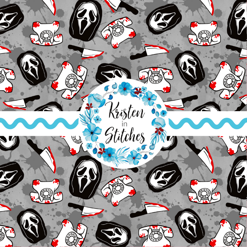 No, you hang up. Horror slasher face masks, bloody knives and telephones with blood splatter.