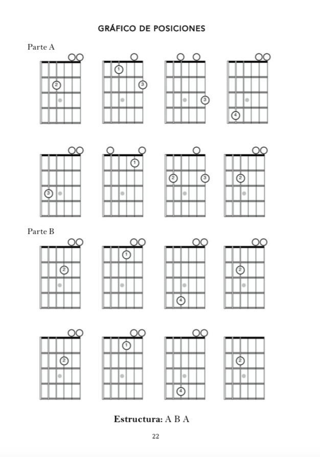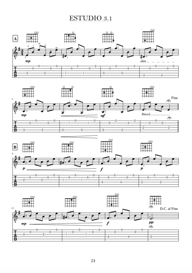 Podrás elegir tocarlos mediante la partitura, la tablatura o los gráficos de las posiciones y arpegios.
