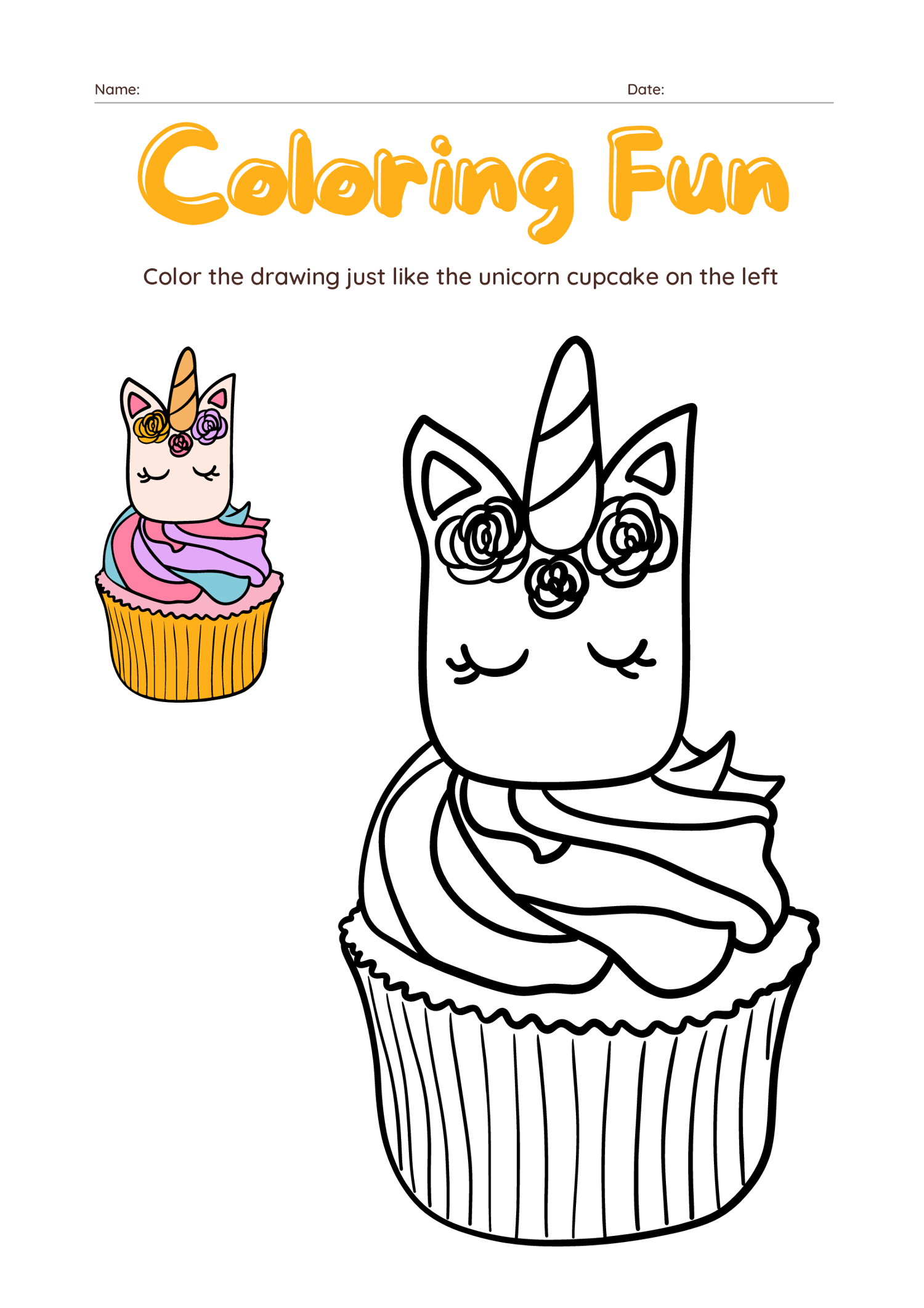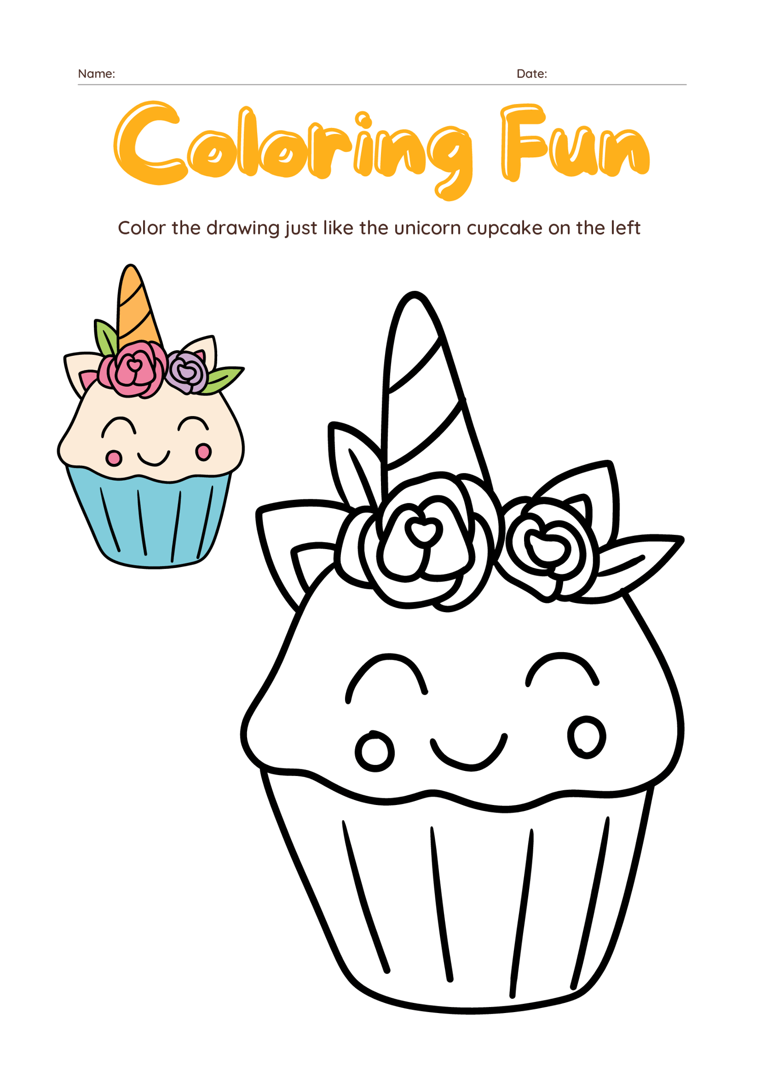 Spark your child’s imagination with this whimsical Unicorn Cupcake Coloring Worksheet Set! Each page invites young artists to color the drawing just like the cute unicorn cupcake shown—a delightful way to develop color recognition, attention to detail, and creativity.