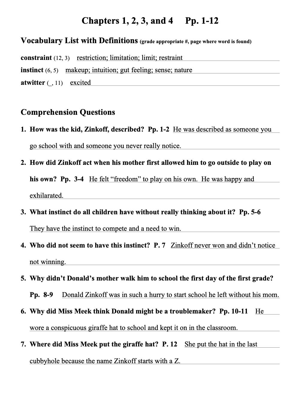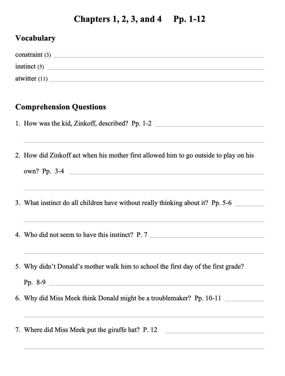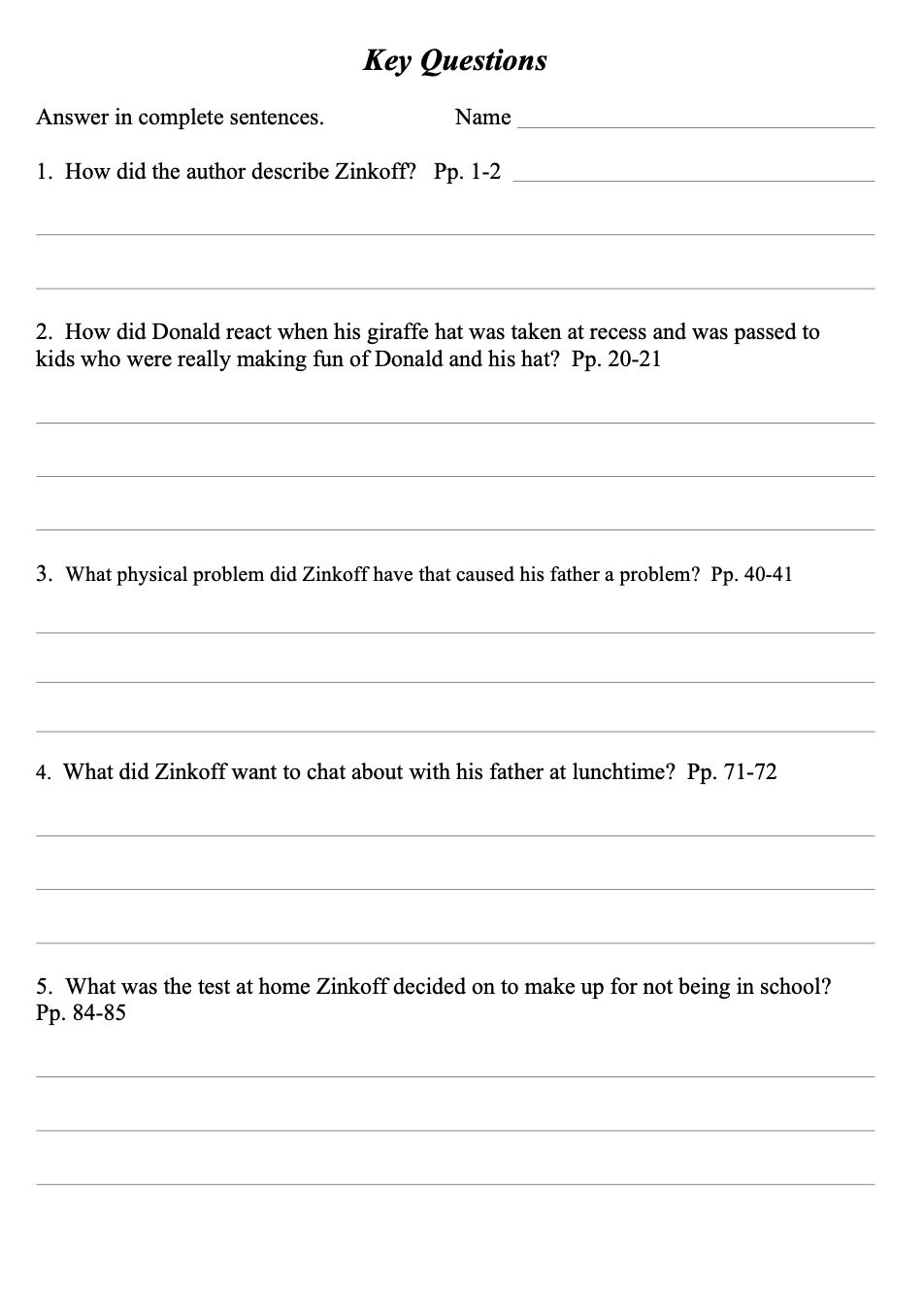 A brief worksheet providing ten questions covering key elements of the story with blanks provided for a studen’t answers.