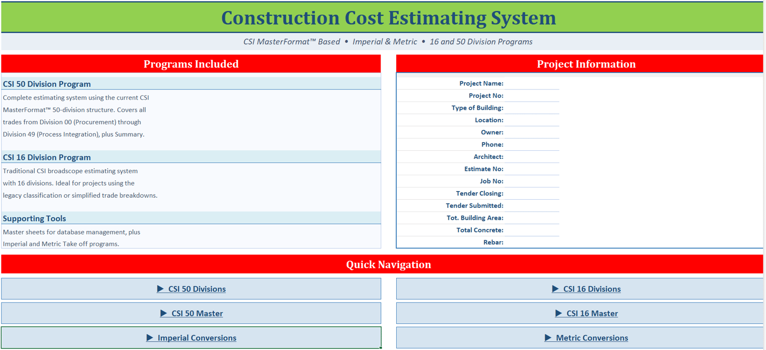 - 45 YEARS OF EXPERIENCE BUILT IN — This is the actual system I refined over four decades of bidding real projects up to twin 40-storey high-rises. Not a software developer's idea of estimating — an estimator's actual workflow.