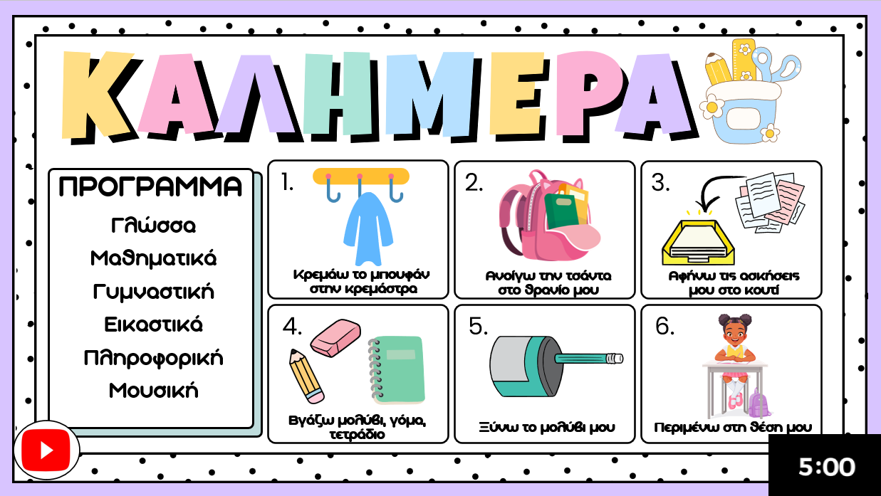 - Πρόγραμμα ημέρας & βήματα ρουτίνας με έτοιμα εικονίδια 🧥🎒✏️