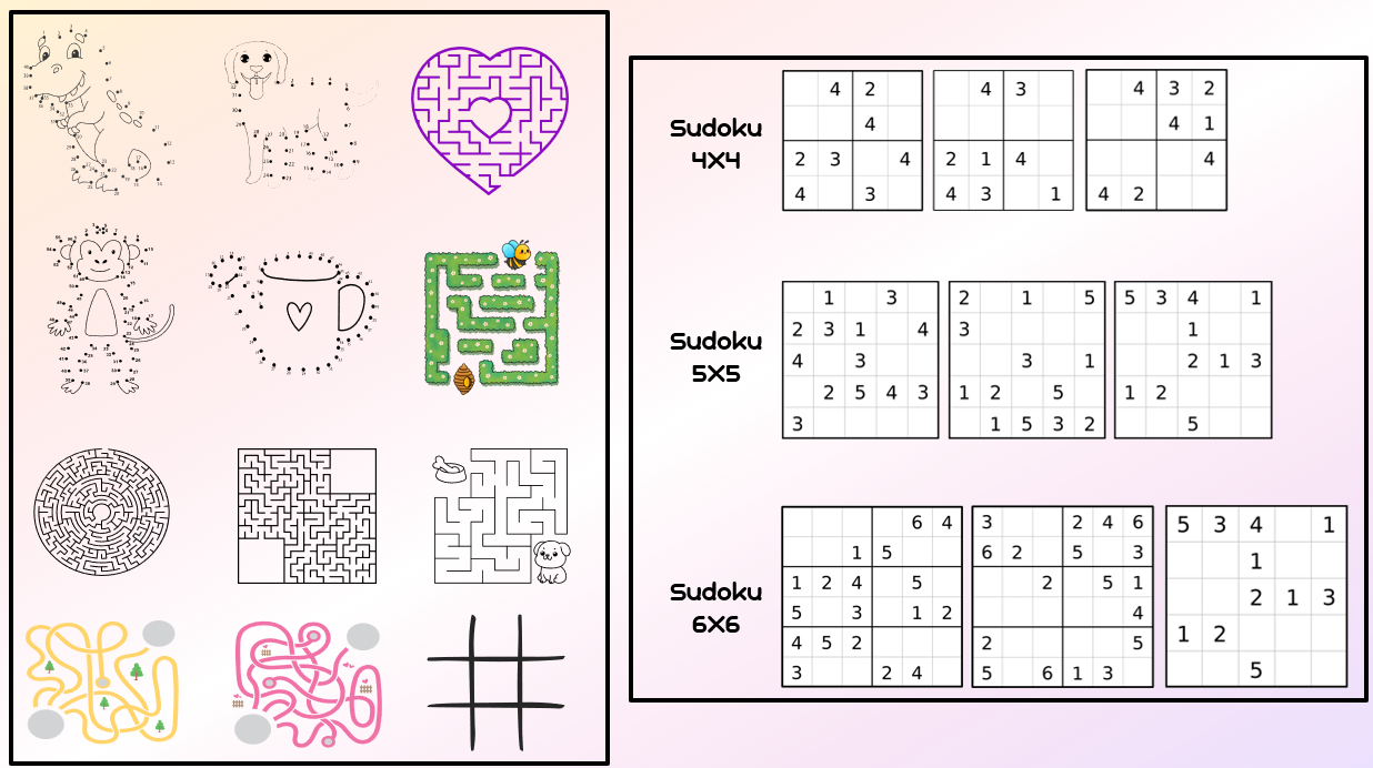 - Sudoku 4×4, 5×5, 6×6, λαβύρινθοι, «Βρες τις διαφορές», μοτίβα κ.ά.