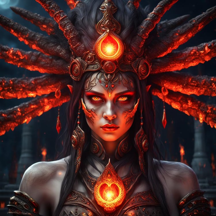 Unleash the fiery power of the "Majestic Fire Sorceress Queen," a photorealistic digital portrait that captures the intense gaze and commanding presence of a sorceress queen within the blazing confines of an Inferno Temple. This stunning artwork showcases the fire sorceress queen with glowing red eyes, exuding an aura of majesty and raw power.