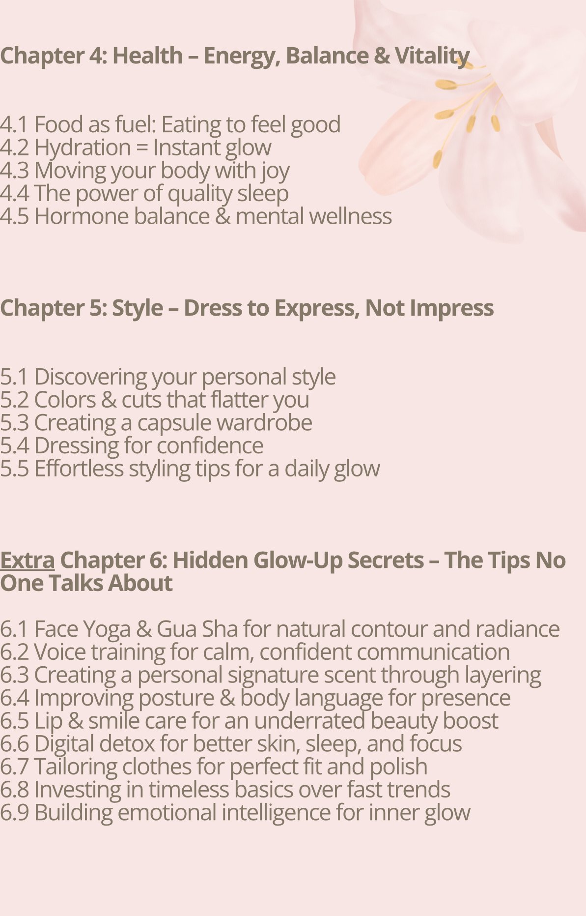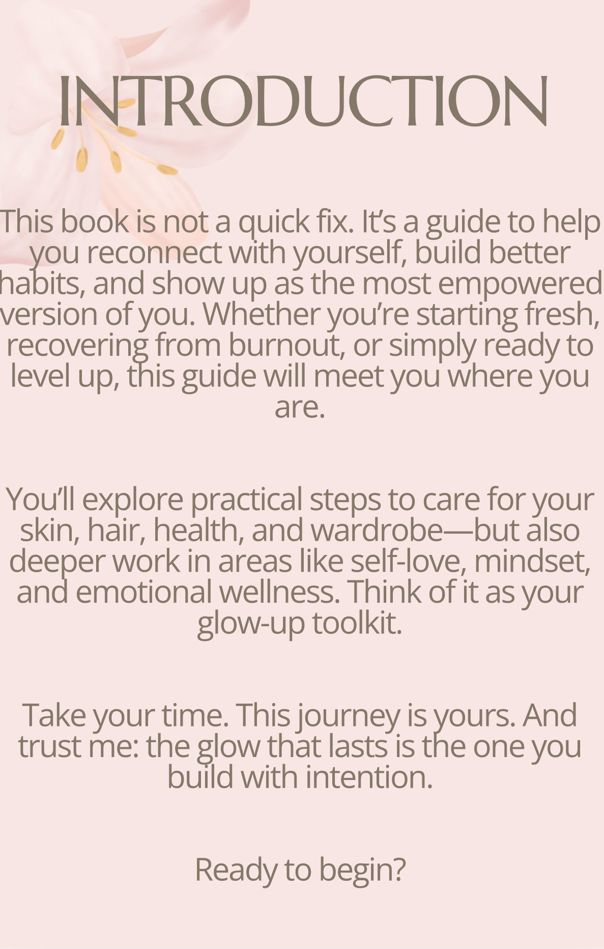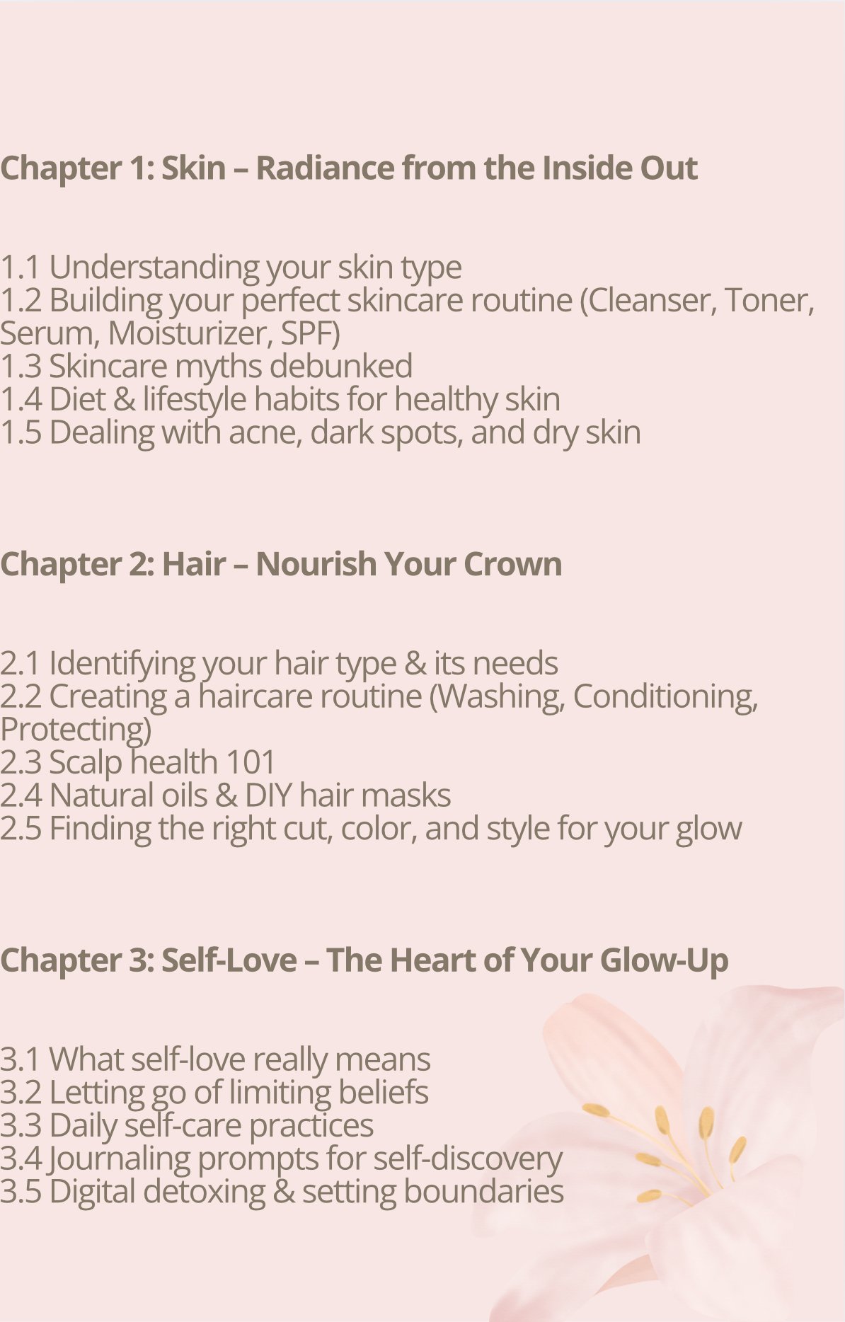 This eBook is your all-in-one roadmap to glowing up from the inside out. From skincare and haircare to self-love, health, and style – you’ll find practical tips, hidden beauty secrets, and empowering routines to support your transformation.