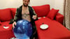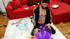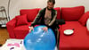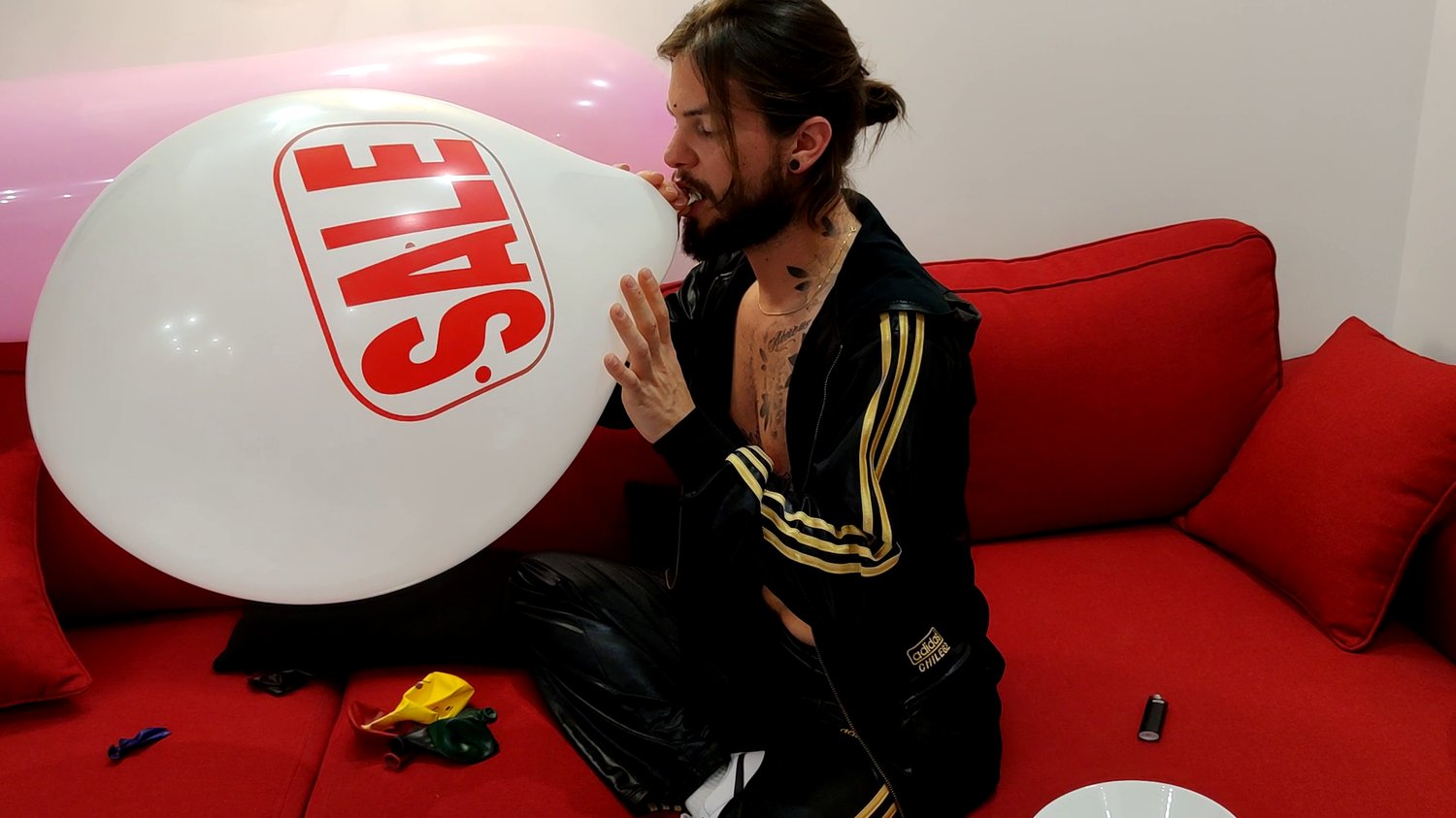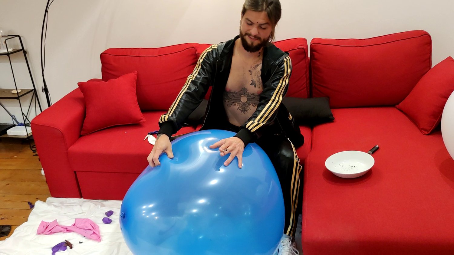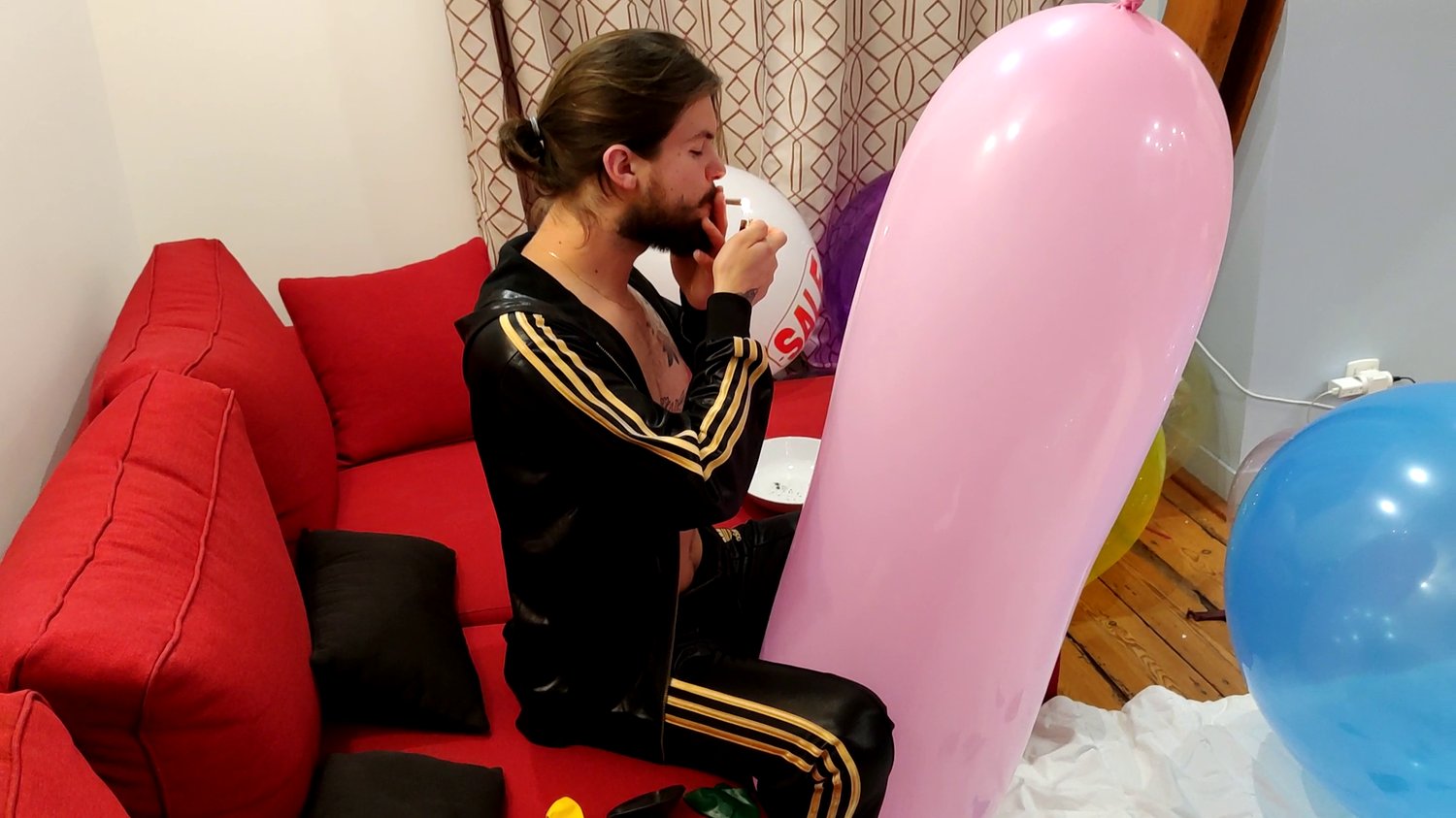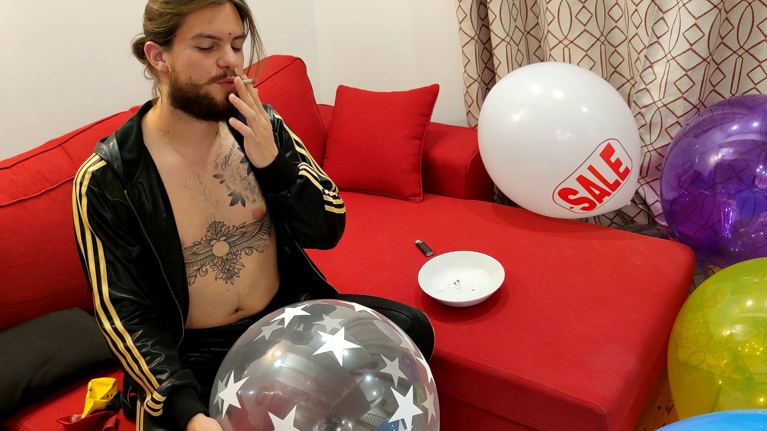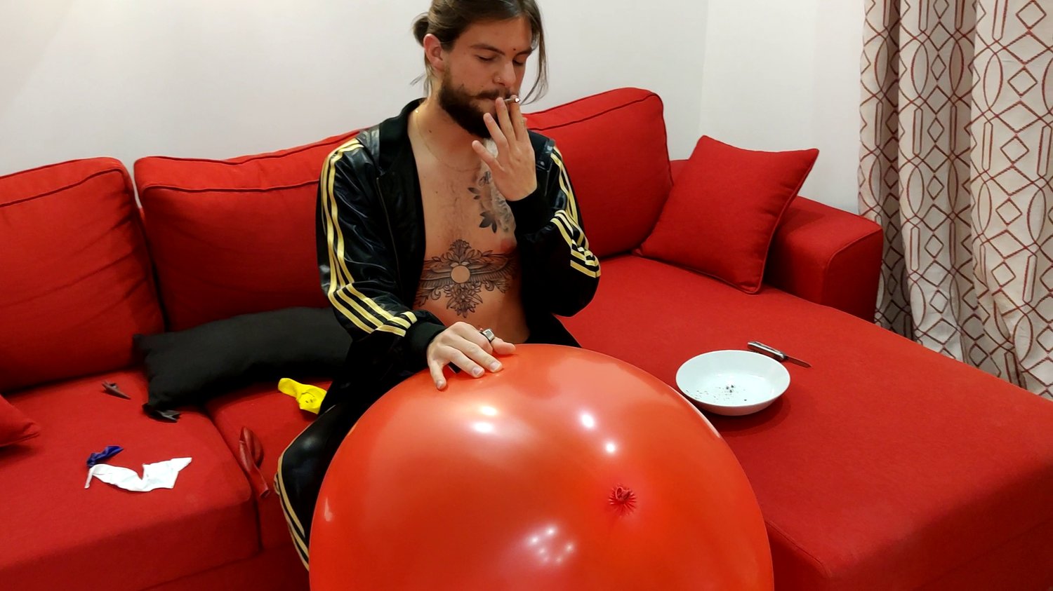 Wearing a adidas chile Léo burst balloons with his cigarette his hands or a knife.