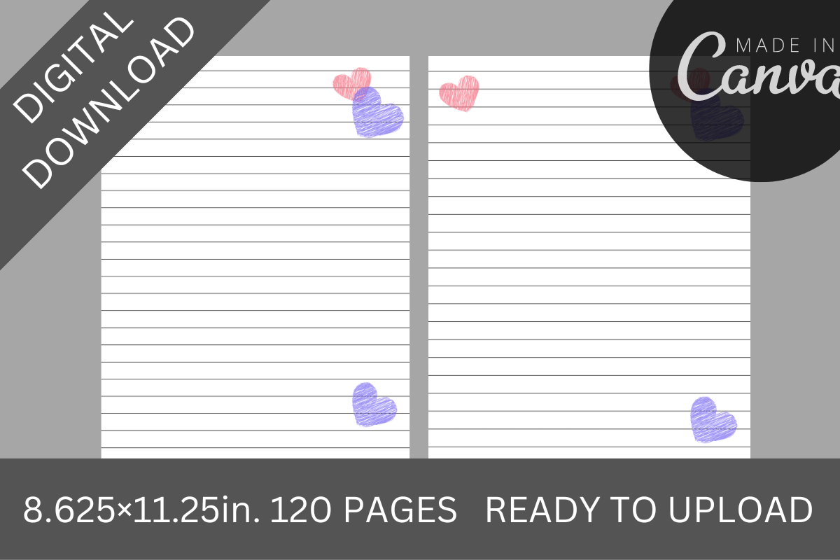 INTERIOR+COVER FOR LOVE THEMED KDP LINED PAPER, LOW CONTENT BOOK FOR KDP READY UPLOAD, HEART THEMED KDP JOURNAL PAPER, JOURNAL NOTEBOOK MOCKUPS, KDP CANVA NOTE