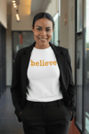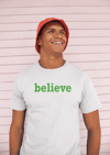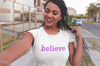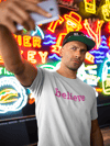 White believe shirt, various lettered colors. Quality material, 100% cotton. Sizes: XS, S, M, L, XL. Clors for letters: hit pink, purple, yellow, red, green. Indicate color and size desired.