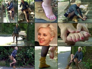 Statuesque Mirna (she's six feet tall) gimps on over to her friends house to show off the single half-shoe she has to wear due to a bone spur. Her long foot and toes stick way out the front of the half shoe. Her friend wants to try on and Mirna agrees. However that leave her large foot bare and her two friends are curious about her bone spur. They can't help themselves though and begin to tickle her tender foot mercilessly. Mirna's foot is very sensitive and she is very ticklish but they continue finger tickling her. Finally, after thoroughly tickling her they give her back her half shoe.