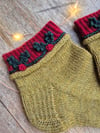 Holly leaves and berries sit like a little winter wreath around your ankles in this pretty festive sock. There is no sewing involved to join the layers together, just knitting, although you may wish to add a few sewn stitches to your work when the knitting is done to keep those delicate leaves in place. To ensure all of the attention goes to your elegant cuff the rest of the sock is plain, relaxing stocking stitch. They also feature a slip stitch heel and rounded toe for a comfortable fit.