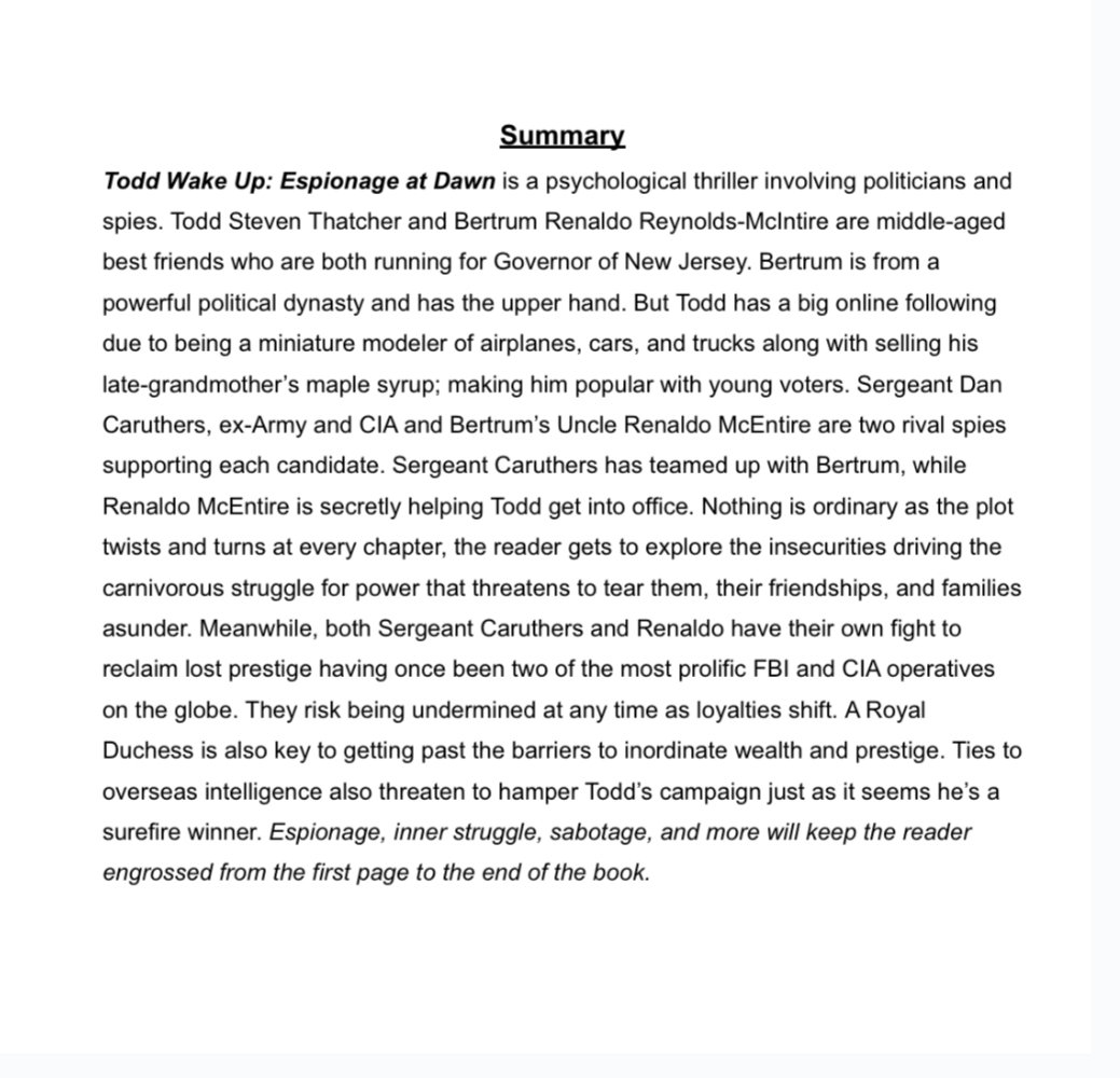 Free Audio Preview! Book and 2 Chapters of Audio. SPY THRILLER! Todd Wake Up: Espionage at Dawn is a psychological thriller involving politicians and spies. Todd Steven Thatcher and Bertrum Renaldo Reynolds-McIntire are middle-aged best friends who are both running for Governor of New Jersey. Bertrum is from a powerful political dynasty and has the upper hand. But Todd has a big online following due to being a miniature modeler of airplanes, cars, and trucks along with selling his late-grandmother’s maple syrup; making him popular with young voters. Sergeant Dan Caruthers, ex-Army and CIA and Bertrum’s Uncle Renaldo McEntire are two rival spies supporting each candidate. Sergeant Caruthers has teamed up with Bertrum, while Renaldo McEntire is secretly helping Todd get into office. Nothing is ordinary as the plot twists and turns at every chapter, the reader gets to explore the insecurities driving the carnivorous struggle for power that threatens to tear them, their friendships, and families asunder. Meanwhile, both Sergeant Caruthers and Renaldo have their own fight to reclaim lost prestige having once been two of the most prolific FBI and CIA operatives on the globe. They risk being undermined at any time as loyalties shift. A royal Duchess is also key to getting past the barriers to inordinate wealth and prestige. Ties to overseas intelligence also threaten to hamper Todd’s campaign just as it seems he’s a surefire winner. Espionage, inner struggle, sabotage, and more will keep the reader engrossed from the first page to the end of the book.