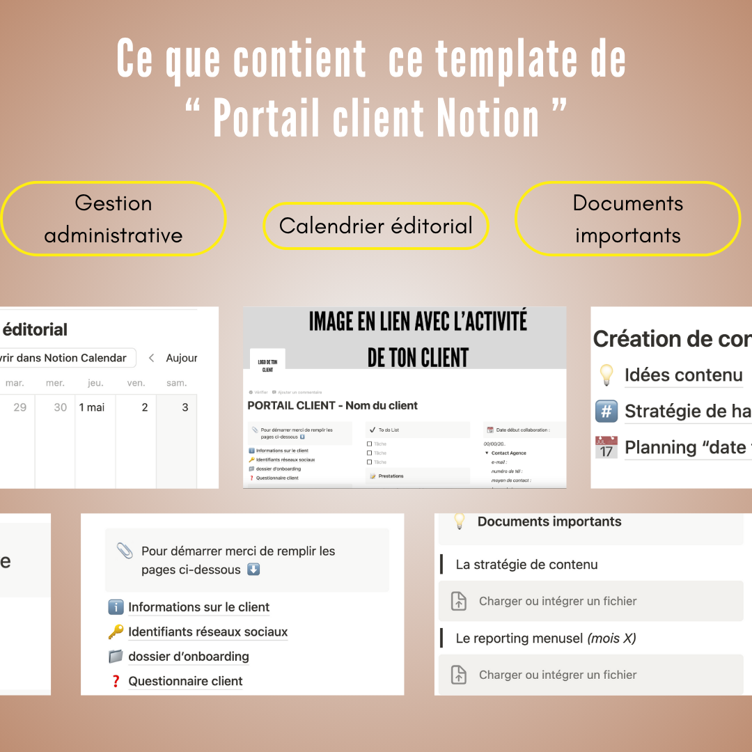 Conçu pour les freelances, Social média manager ou Community Managers, ce template vous permet de centraliser toutes les informations essentielles liées à chaque client dans un seul espace collaboratif.