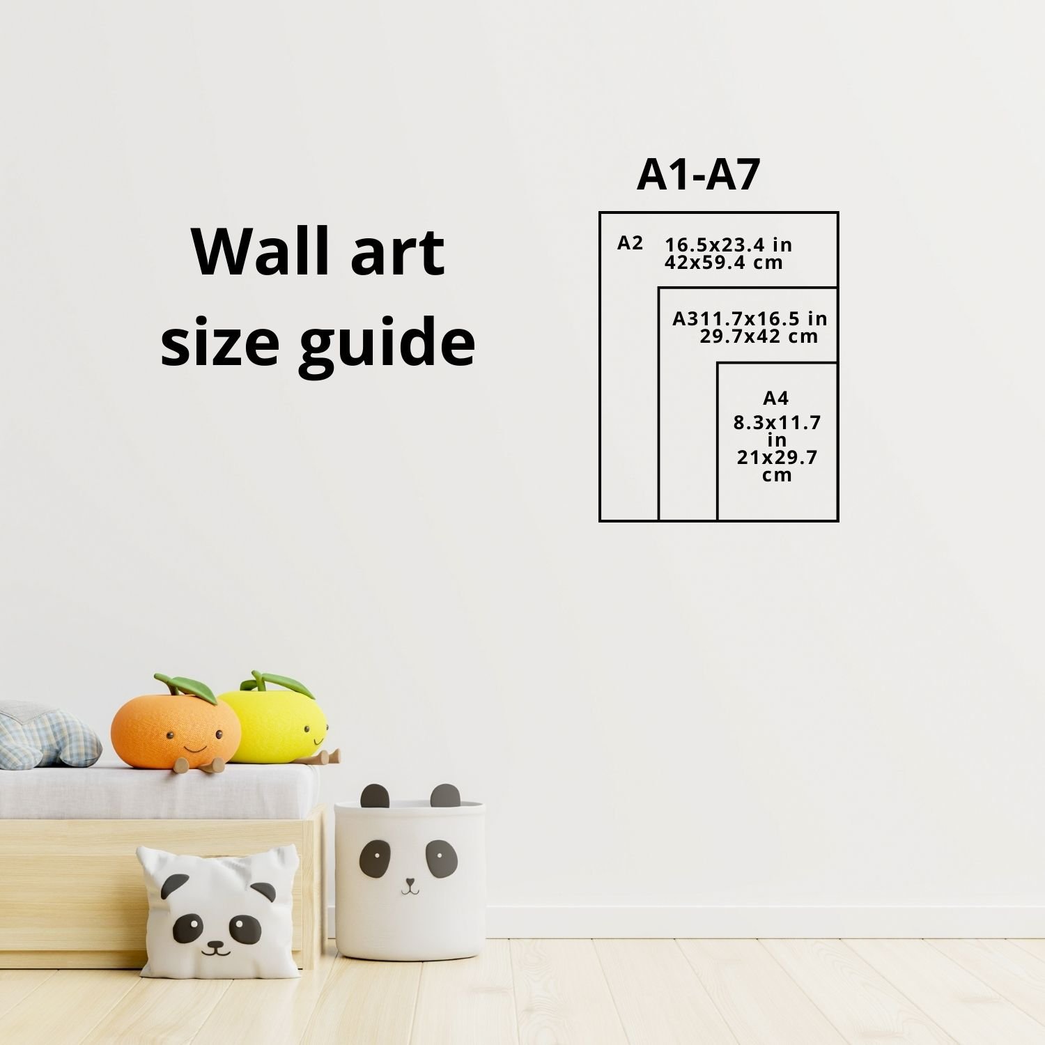 Please see the Wall art size guide in the photo gallery of this product for more information.