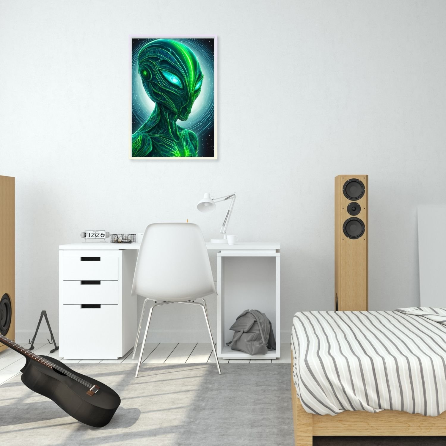 Teenager wall art decoration room. Green Alien monster portrait. Youht christmas birthday gift.