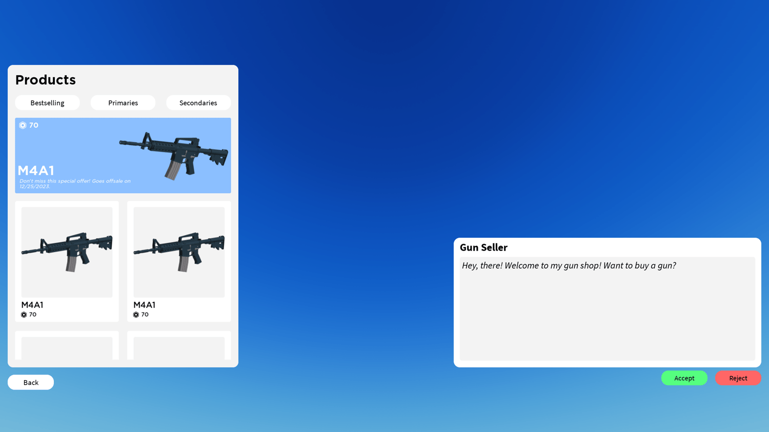 A gun store system perfect for any group whether its a clothing group or military gun shop this product suits them all. It's features allows you to configure it to your liking. Further it uses a credit system ( if turned on in the config script ) which is already scripted with a datastore enabling you to sync your credit system to this gun store with ease or script further add ons such as how you earn those credits and so forth!