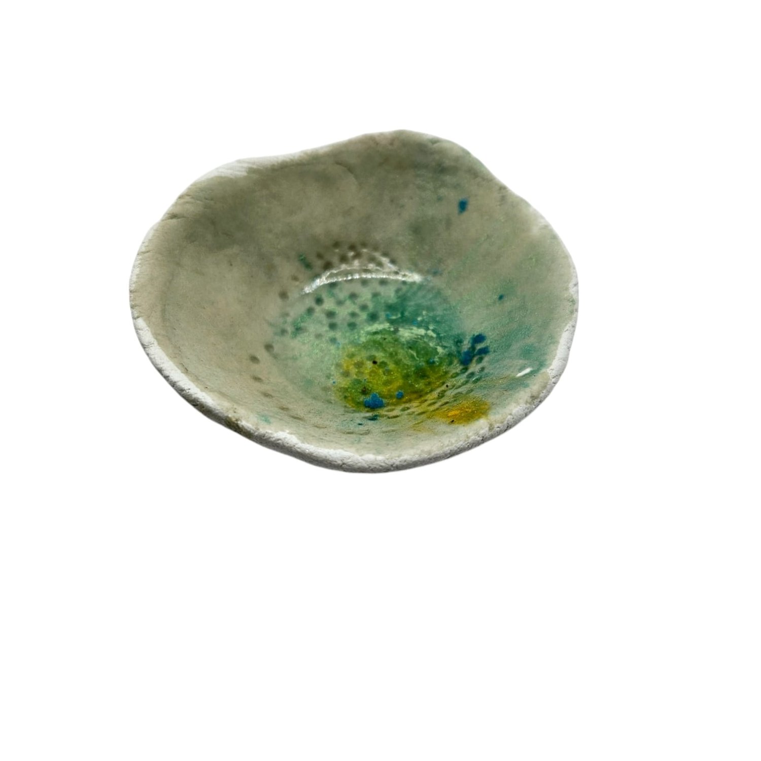 Hand made combining air dry clay, sunflower pollen, pigments and resin.