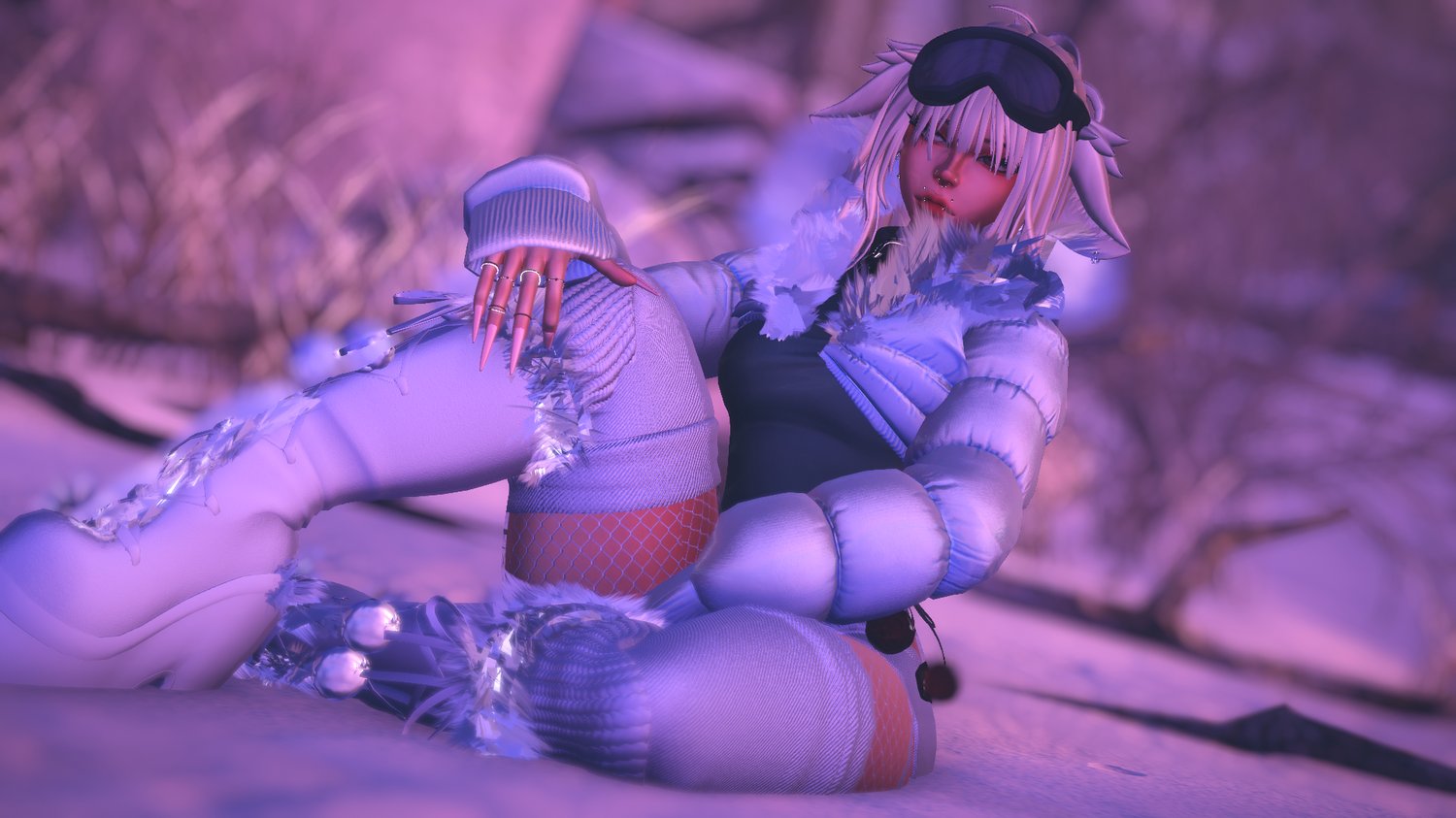 jacket, skirt, botts, ski goggles, snowboard, bra, panties, hair: Nessy 3D