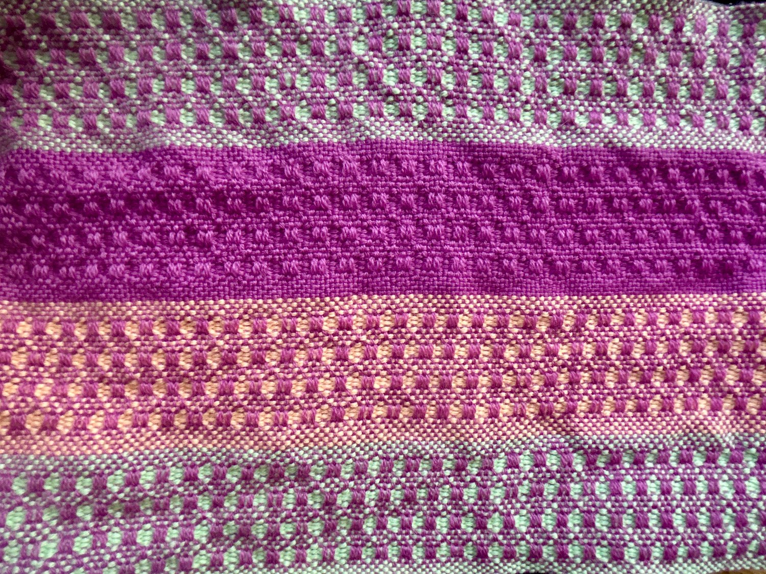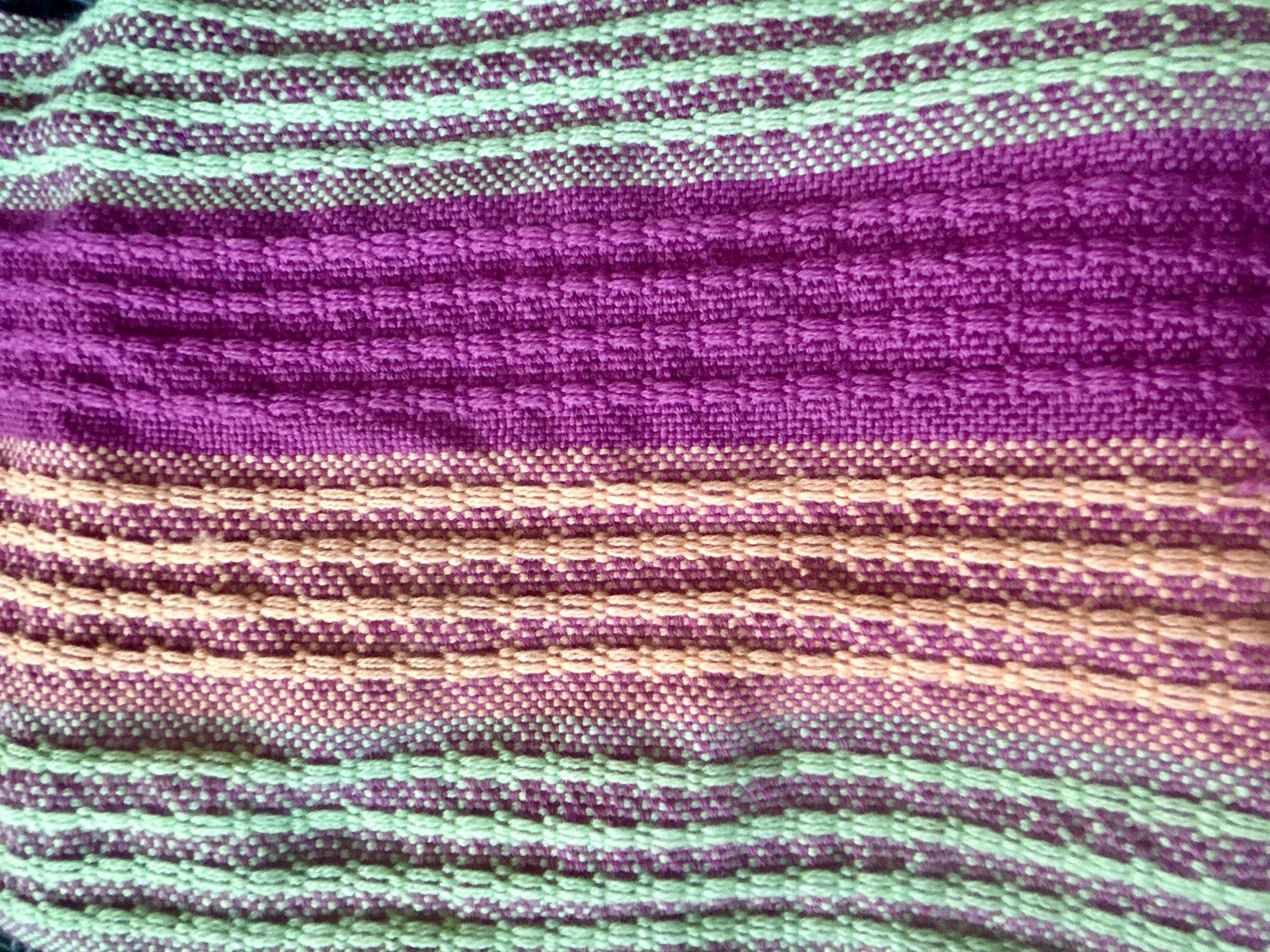 Sur l’un des côtés vous aurez la couleur du fil de trame comme dominante grâce aux flottés de trame. Tandis que sur l’autre côté vous aurez les couleurs de fil de chaîne en dominantes grâce aux flottés de chaîne. Alors choisissez votre côté préféré et drapez-vous de cette écharpe selon votre humeur.