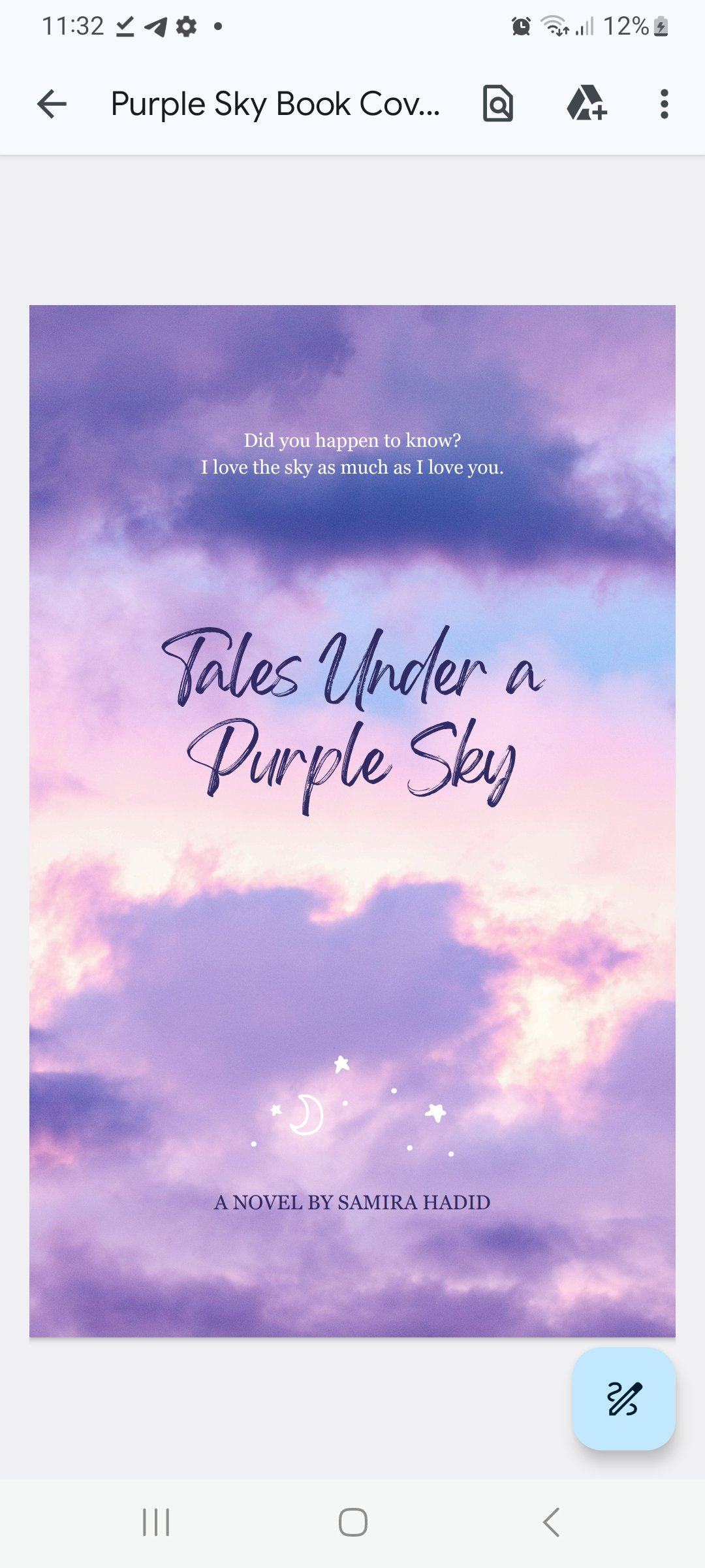 This book cover for Tales Under a Purple Sky by Samira Hadid features a dreamy, romantic aesthetic with a stunning background of a sky painted in soft hues of purple, pink, and blue. The clouds create a serene and poetic atmosphere, complementing the book's title.
