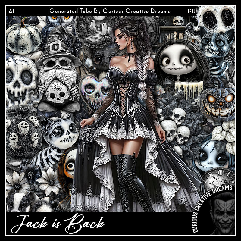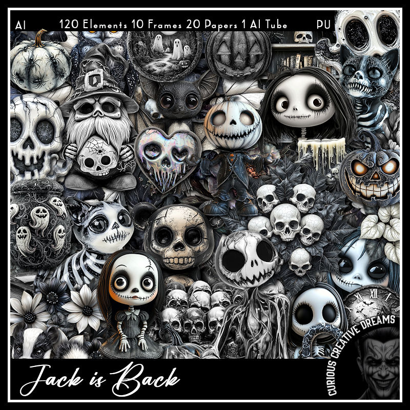 Jack is Back comes with 120 Elements , 10 Frames , 20 papers, 1 AI Generated tube by Curious Creative Dreams . AI Generated included in this kit . Personal use Only