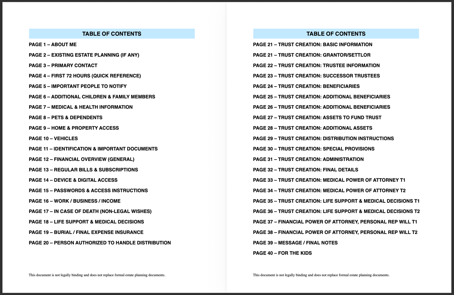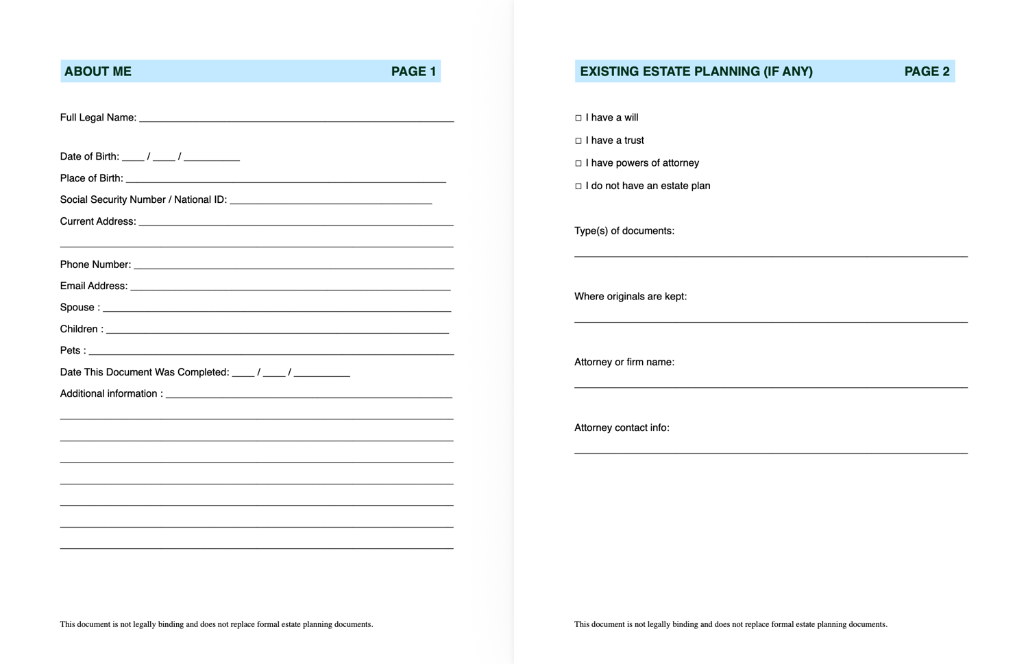 This document is not legally binding. It does not replace a will, trust, power of attorney, or advance directive. It does not grant legal authority or transfer assets. It is a preparation tool meant to reduce confusion and help your family move forward with clarity.