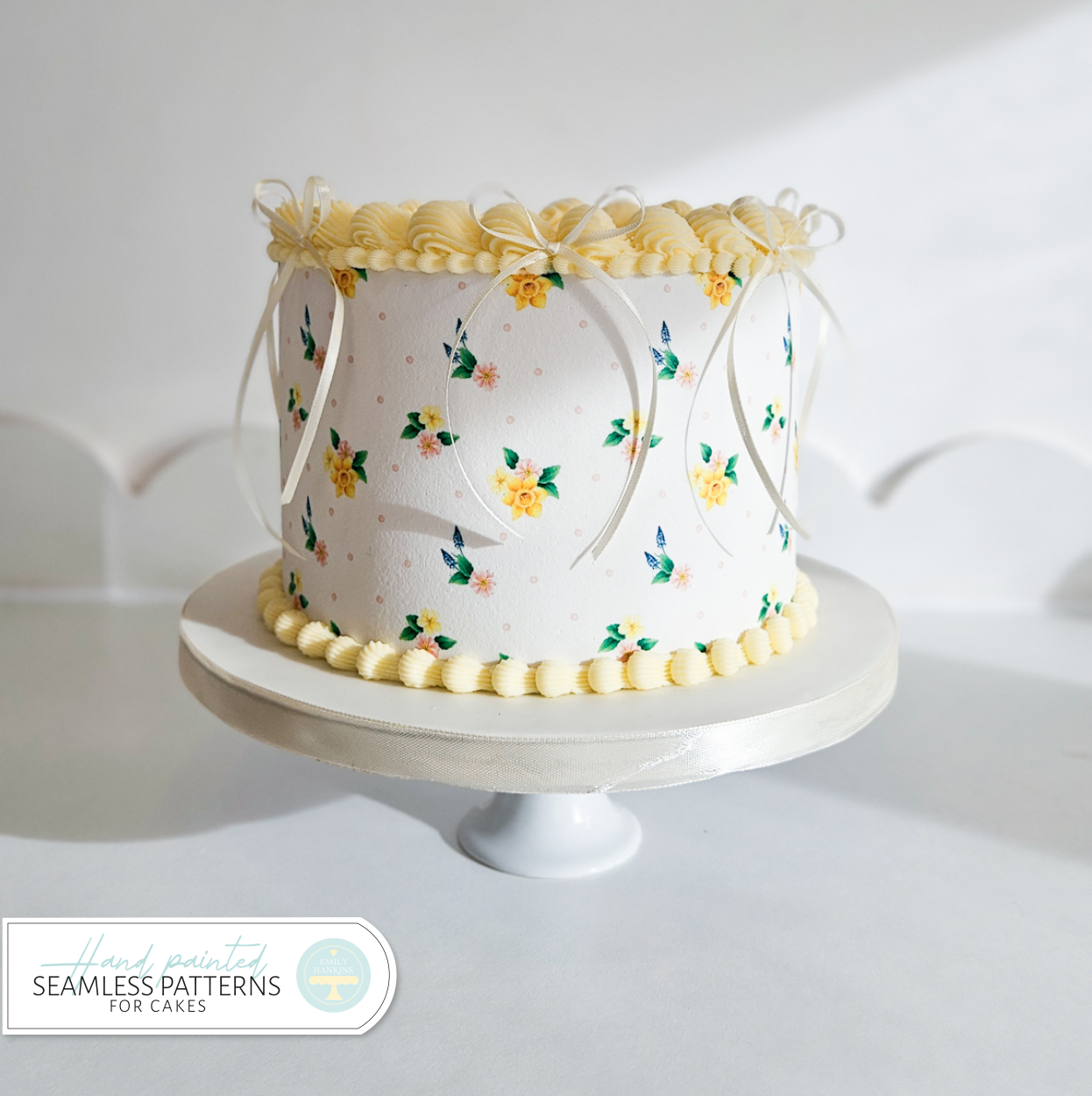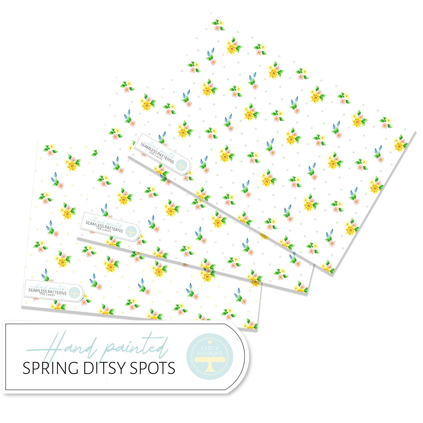The designs are inspired by the little pops of spring colour in my garden. The design features daffodils, muscari and primroses accompanied by either green, lemon or pink spots. Each flower has been hand painted by Emily and painstakingly crafted into a seamless pattern for your cake designs.