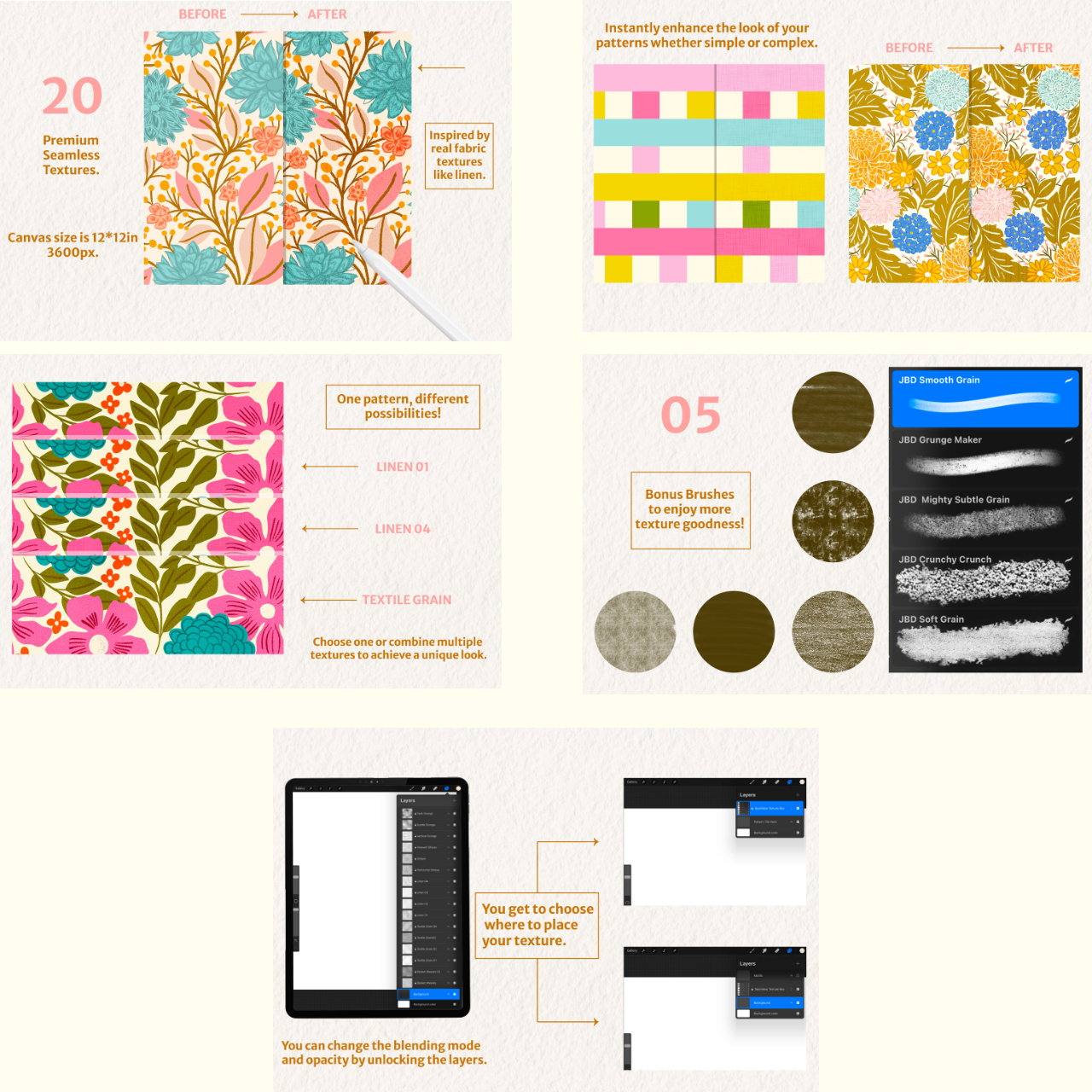 The All in one Procreate Bundle features 3 digital assets for Procreate users from floral stamps to pattern templates and seamless textures to make your surface design process a breeze.