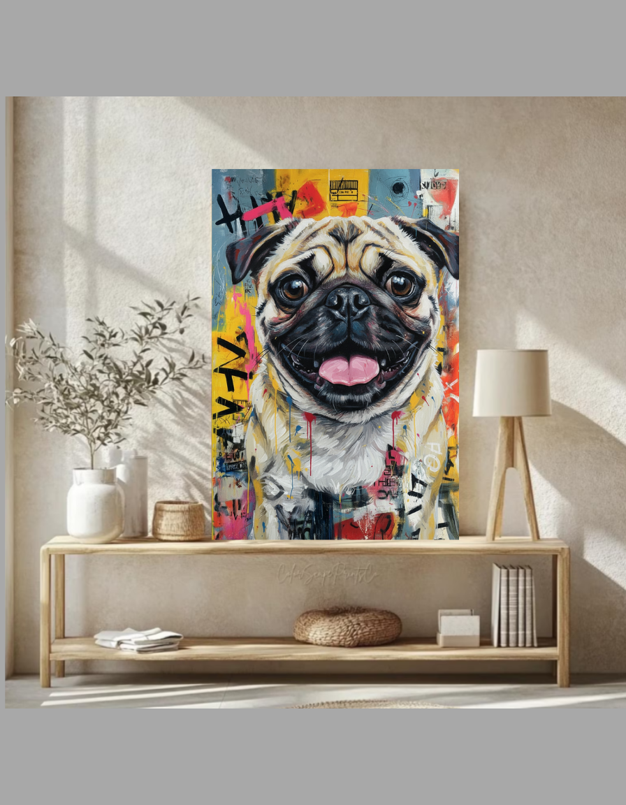 Add a burst of charm and color to your home with this digital download of a Smiling Pug Pop Art Print. This high-resolution PNG features an irresistibly happy pug rendered in a vibrant, graffiti street art style, incorporating bold colors, distressed textures, and urban elements. Perfect for pug lovers, modern pet owners, or anyone seeking a unique and cheerful statement piece. Instantly download and print this dynamic, contemporary animal portrait for a living room, kid's room, or pet-themed decor.