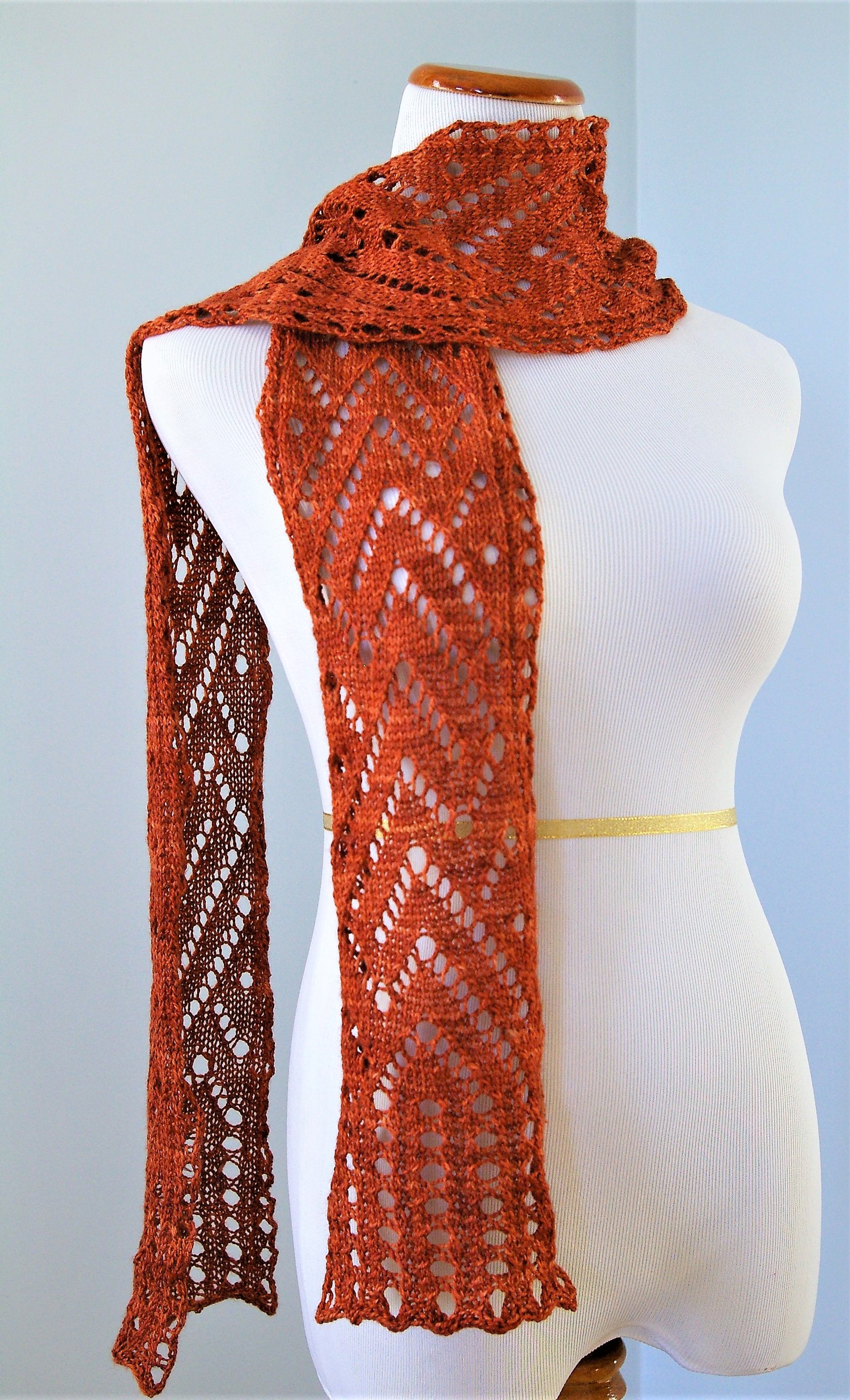 - 1 skein Anzula Silken (370yd / 338m to 4.02oz / 114g; 50% silk, 50% merino wool) Colorway: Rust OR 300yd / 275m fingering-weight merino/silk blend or other wool blend yarn
