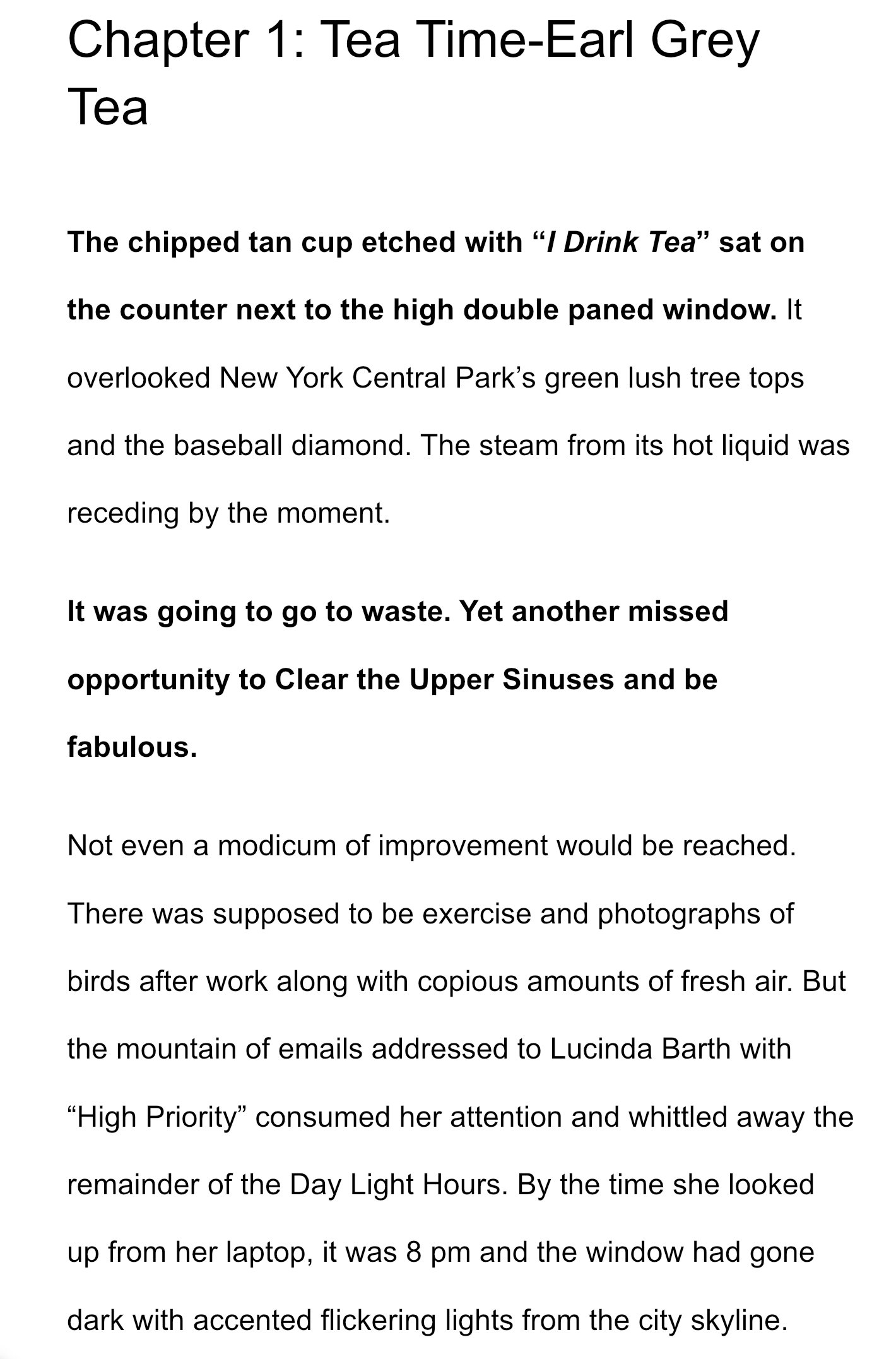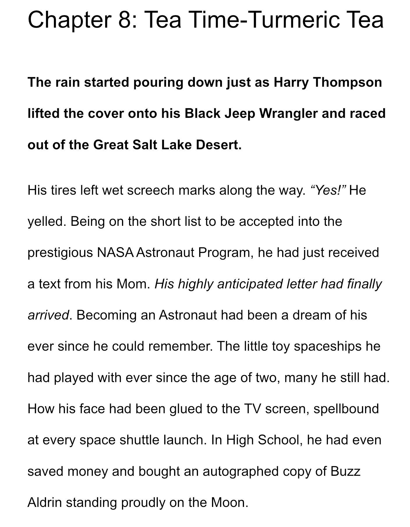 Free Audio Preview! (Book & 2 Chapters of Audio). This fictional story is a witty and vivid portrayal of how Various Types of Teas affect the Body and Mind in unique ways. There are many Tea Baristas that tout its amazing benefits, but very few specifically describe how the tea makes you feel. This story brings the reader along fantasy journeys during Tea Time. Whether being transported to run through the lawn of an English castle as coughs ease or to land a Spaceship on Mars as the body is reinvigorated. Humorous and Joyful Tea Time Fun.