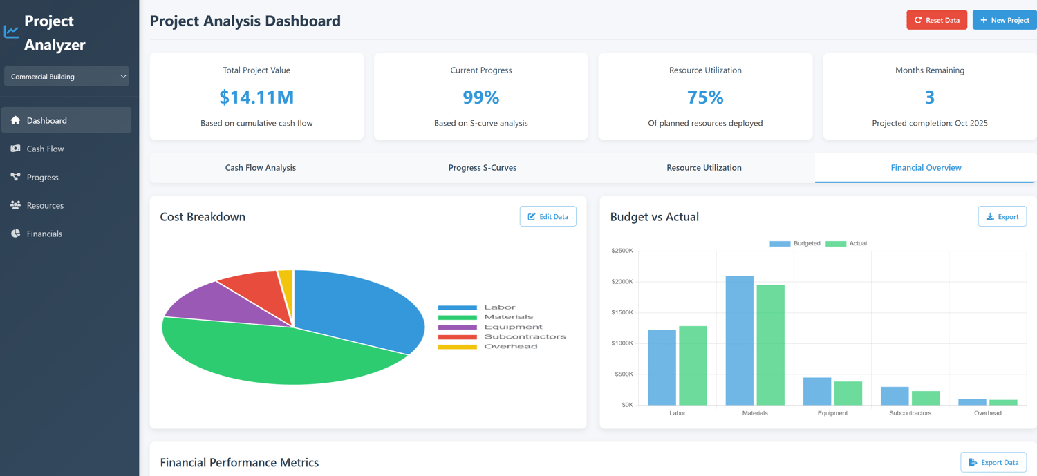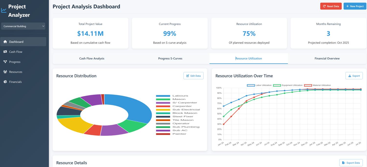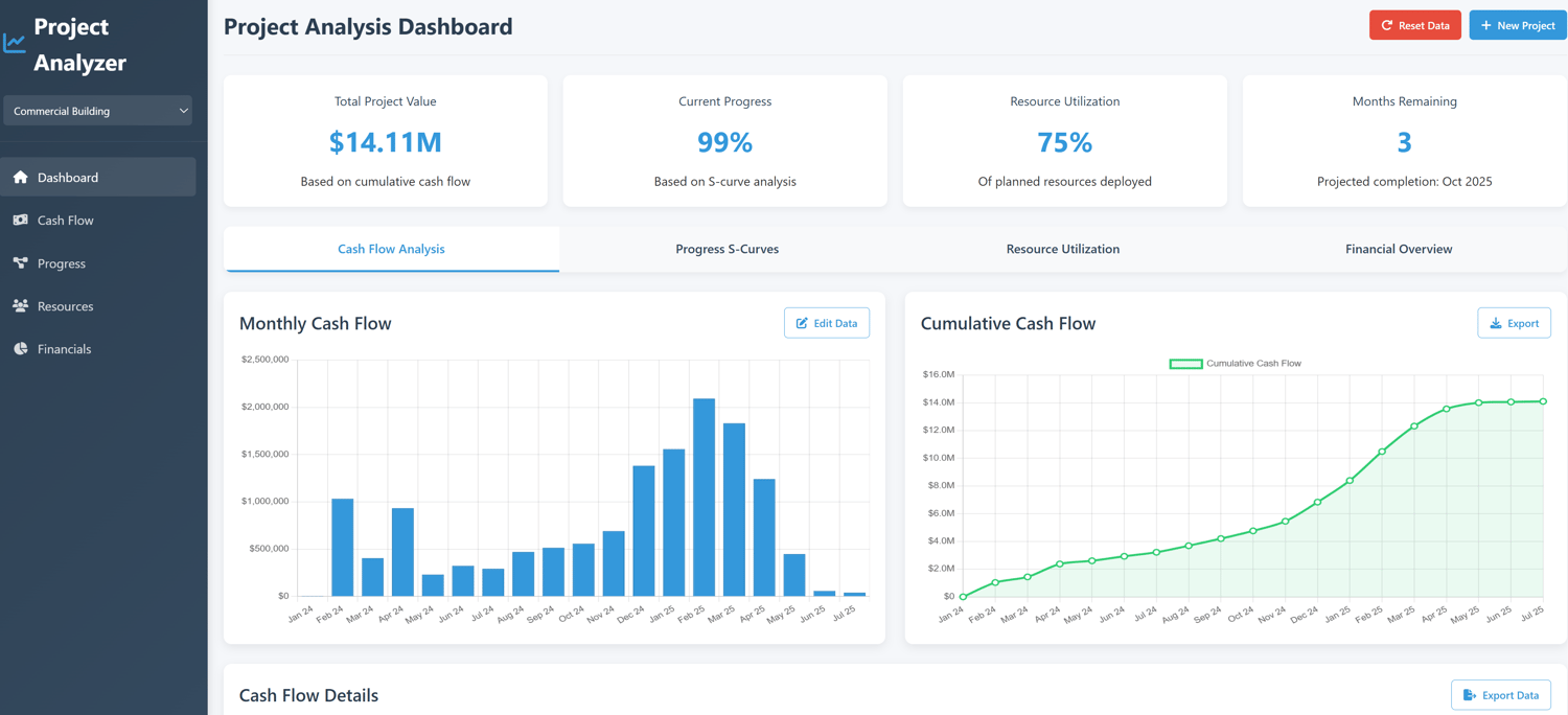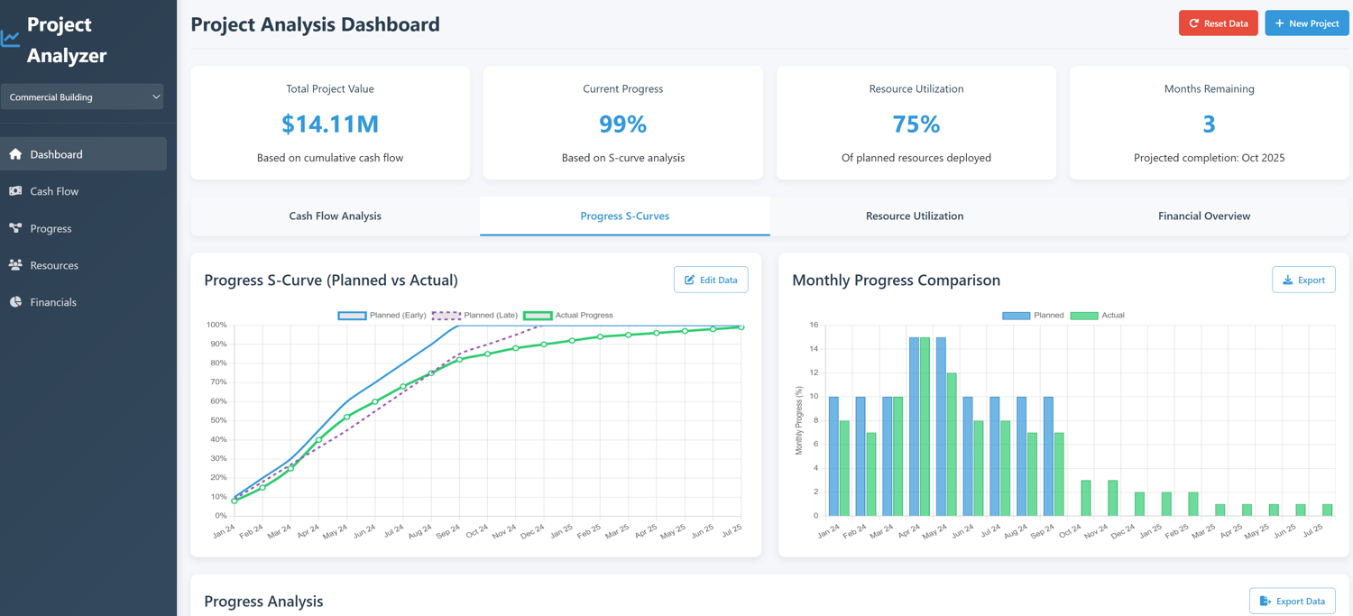 - View Data: The dashboard shows cash flow, progress S-curves, resource utilization, and financial overview