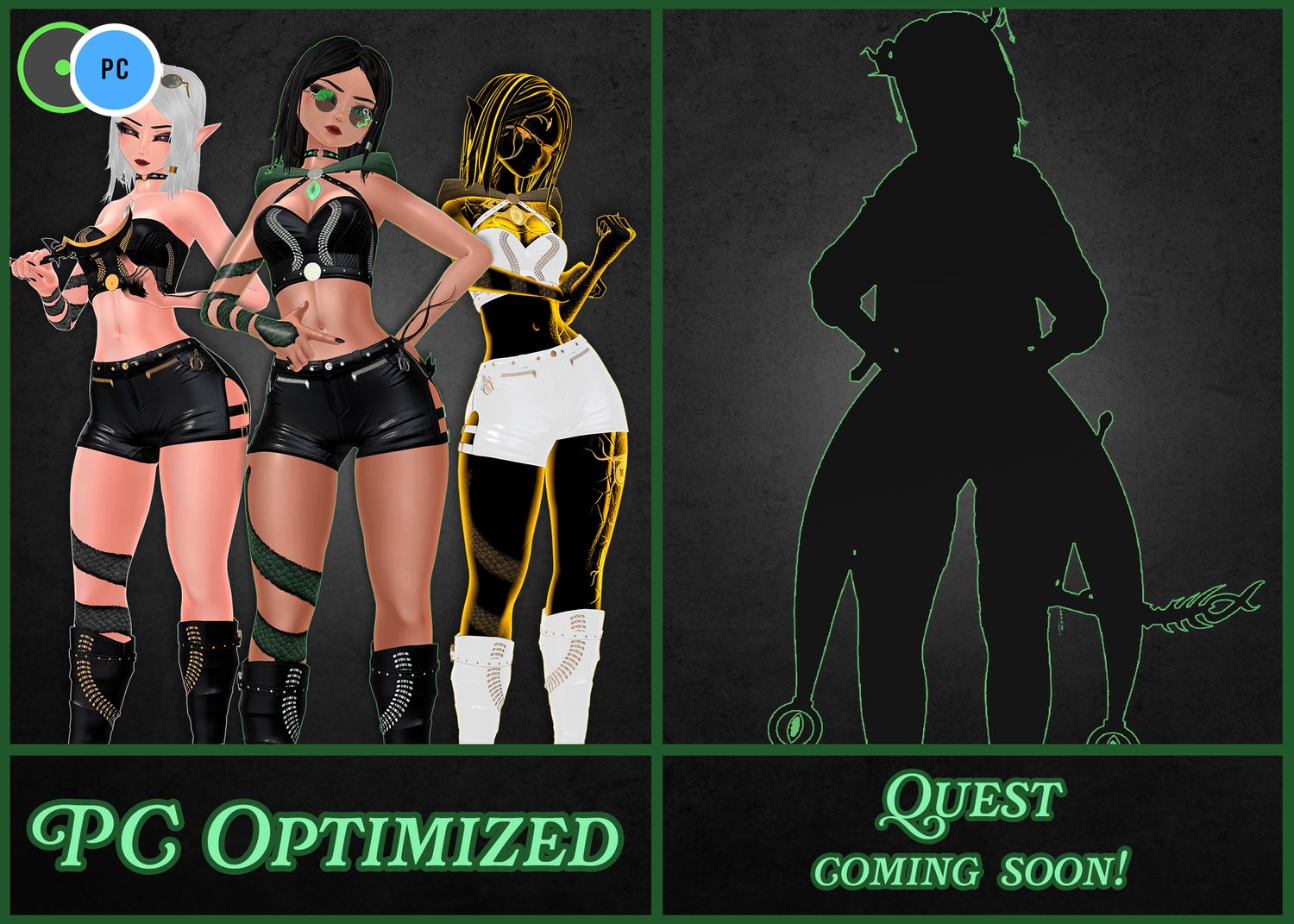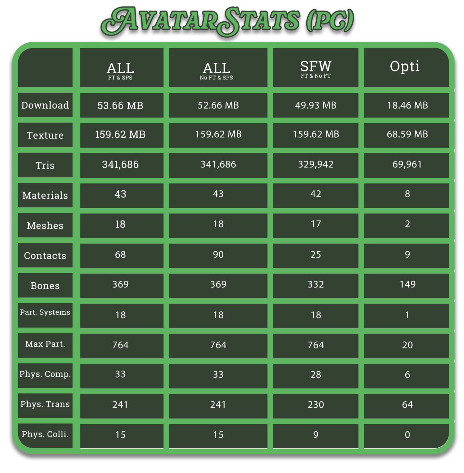 - This avatar uses JeTeesS' memory optimizer in order to create more parameter space on the face tracked versions. (DISCLAIMER! This causes other players to see some delay in the avatar's toggles. Regardless, other players will still see the same settings as you! It just may take an extra second or two to activate.)