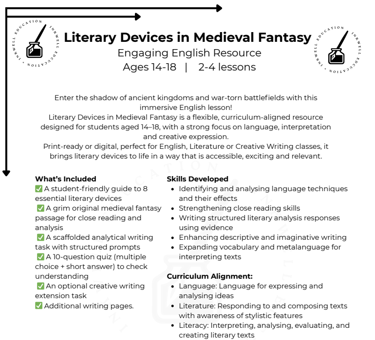 Literary Devices in Medieval Fantasy is a flexible, curriculum-aligned resource designed for students aged 14–18, with a strong focus on language, interpretation and creative expression.
