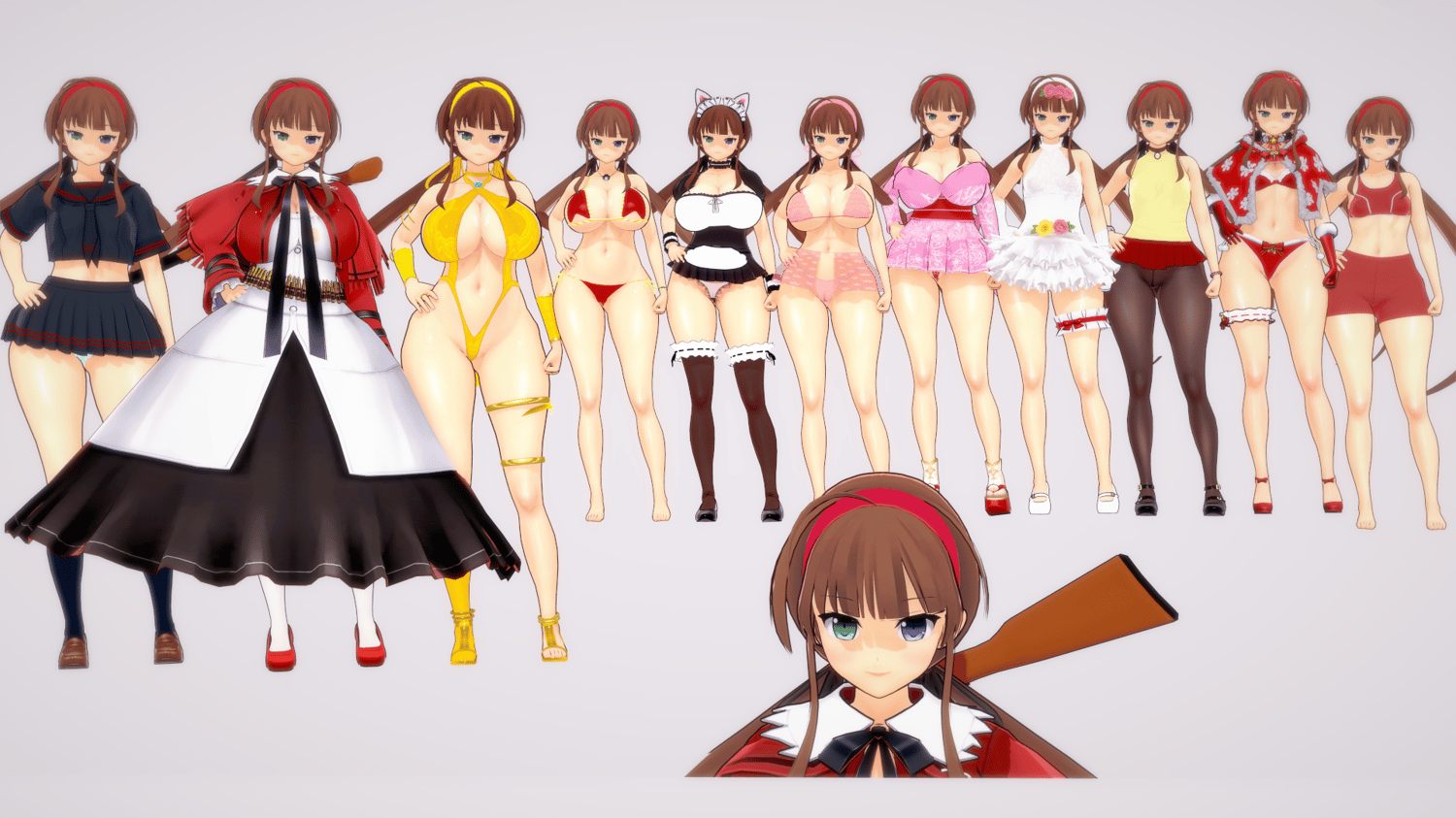 Ryoubi includes various costumes, shinobi, bunny, special,2 bikinis, one big boobed and flat mode, christmas, maid, white dress ballerina, sports, etc.