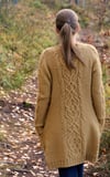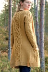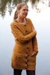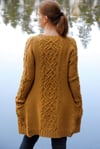 The Comeback Cardigan is a return to my first love in knitting: epic cables.This thigh-length cardigan is worked from the top down in aran-weight wool. The cardigan features intricate cable panels running down the mid back and sleeves. Cabled pocket details accentuate the otherwise simple, reverse stockinette front.