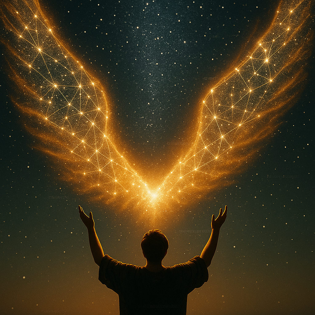 The sky bends low, not in feathers but in fire. Stars gather into a vast wing, spanning horizon to horizon, their sparks falling like messages onto the lifted arms of the one who dares to look up. In its silent descent lies prophecy: burdens to bear, paths to walk, destinies written not just above, but upon the skin.
